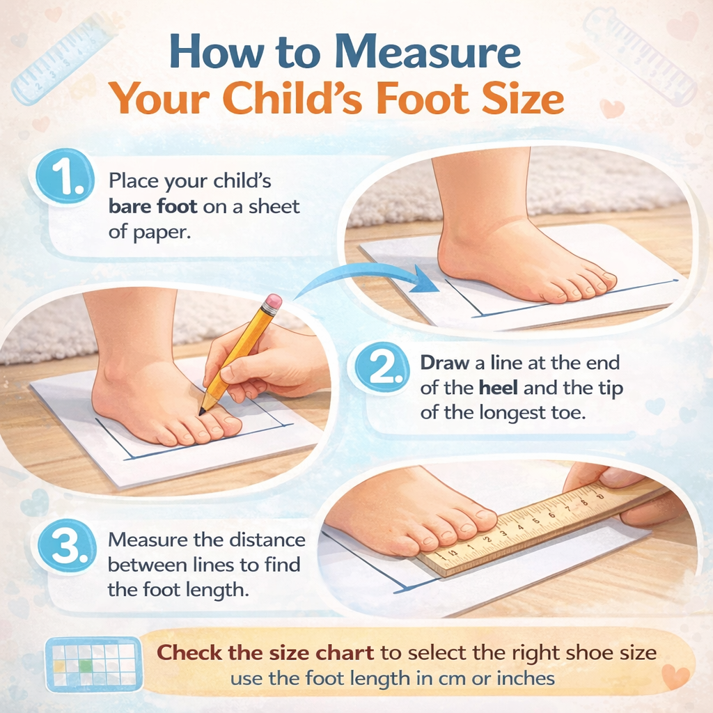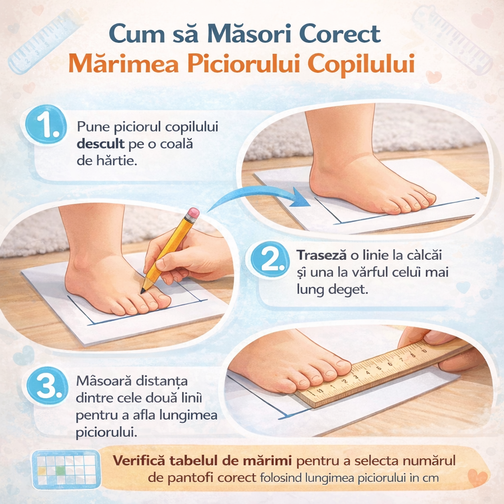 Sfat pentru parinti: Masurati talpa copilului in centimetri si adaugati aproximativ 0,5 cm pentru libertate de miscare. Asa veti alege marimea perfecta si copilul va fi confortabil.