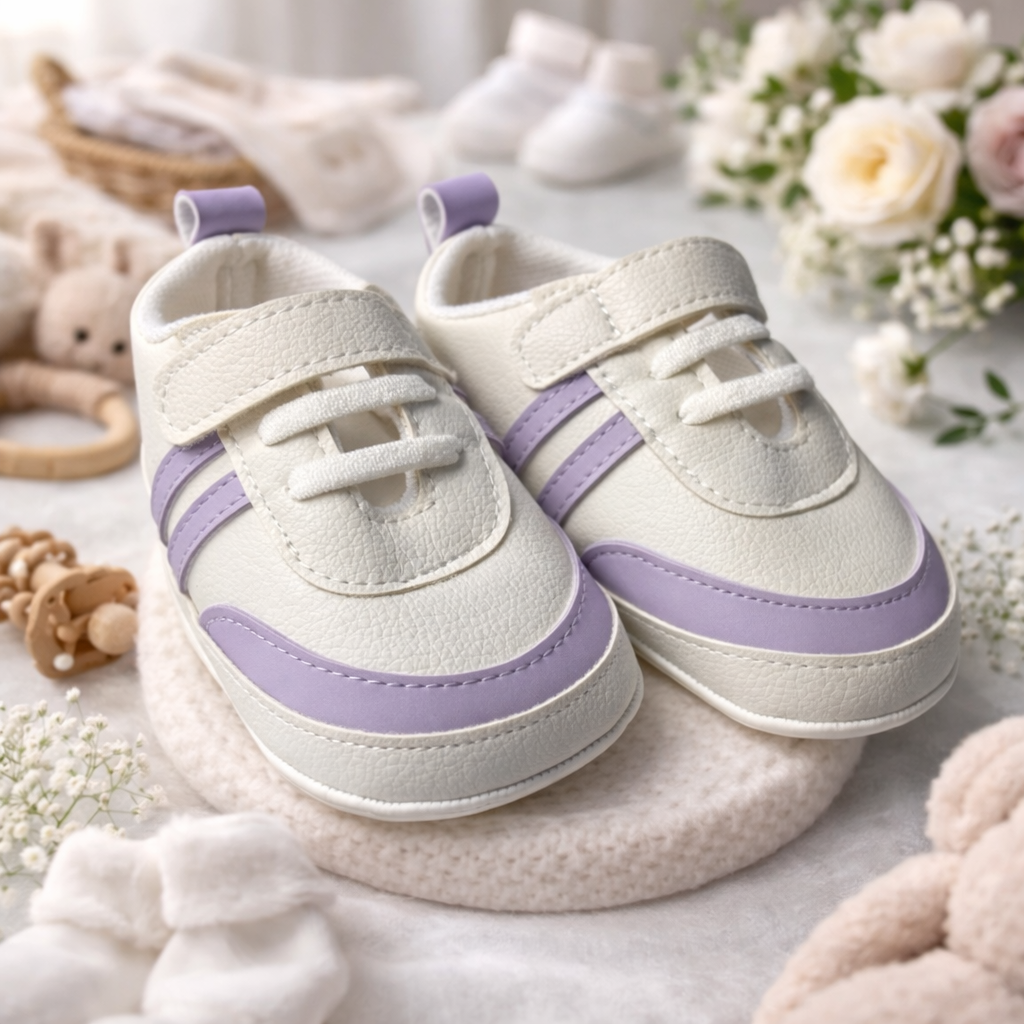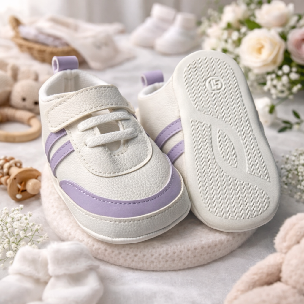 Adidasi pentru bebelusi marca BEBLUX, de culoare alb cu accente mov, cu design modern si sistem de inchidere cu arici pentru o fixare usoara si rapida. Modelul este practic si usor de incaltat, ideal pentru parinti.