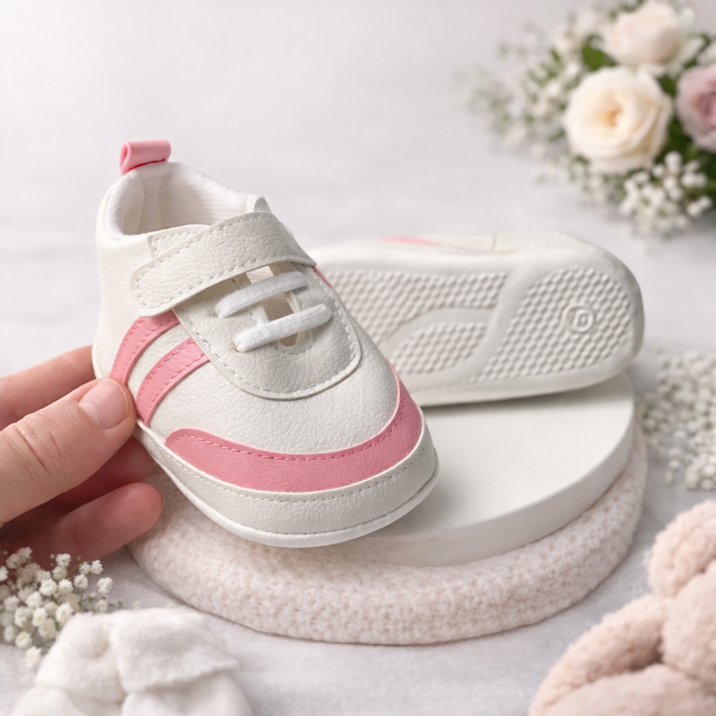 Adidasi pentru bebelusi marca BEBLUX, de culoare alb cu accente de roz, cu design modern si sistem de inchidere cu arici pentru o fixare usoara si rapida. Modelul este practic si usor de incaltat, ideal pentru parinti.