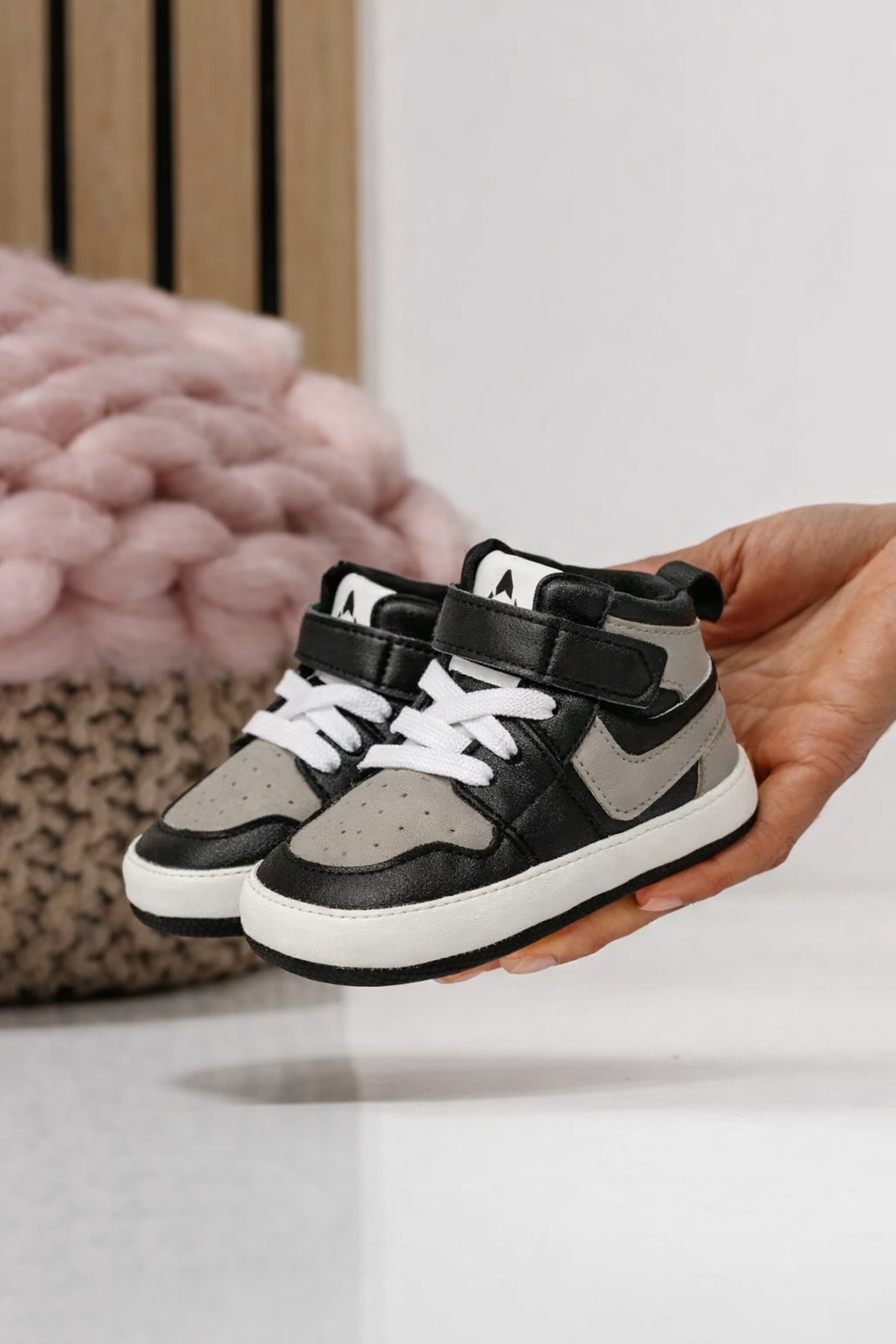 Adidasi inalti pentru bebelusi 3-12 luni, in nuante de negru, gri si alb, cu siret elastic, bareta cu arici si talpa moale din cauciuc. Ideali pentru primii pasi in siguranta!