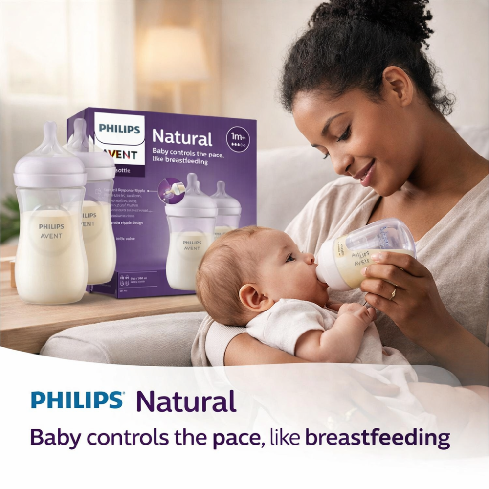Set cu 2 biberoane Natural Response de 260 ml, tetine anti-scurgere cu valva anti-colici si silicon moale ce imita alaptarea naturala. Fara BPA, potrivit pentru hranirea zilnica a bebelusilor.