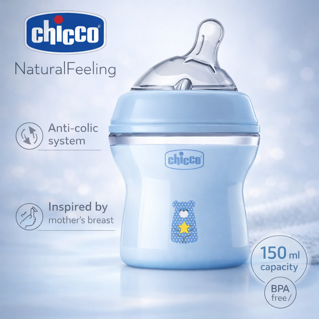 Biberon Chicco NaturalFeeling 150 ml pentru nou nascuti, cu tetina debit lent, sistem anti colici si design inspirat din forma sanului matern. Permite hranirea naturala si tranzitia usoara intre alaptare si biberon.