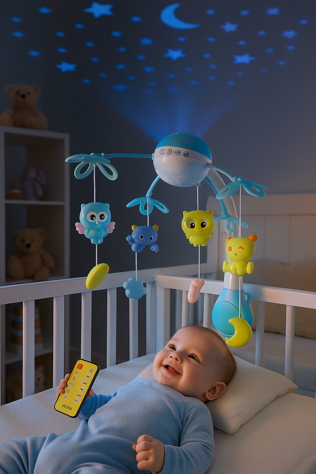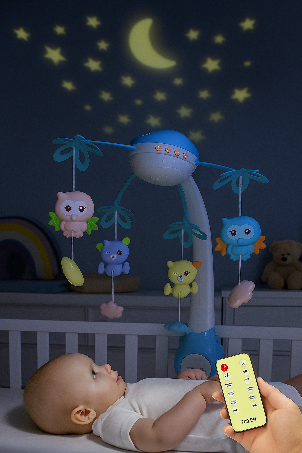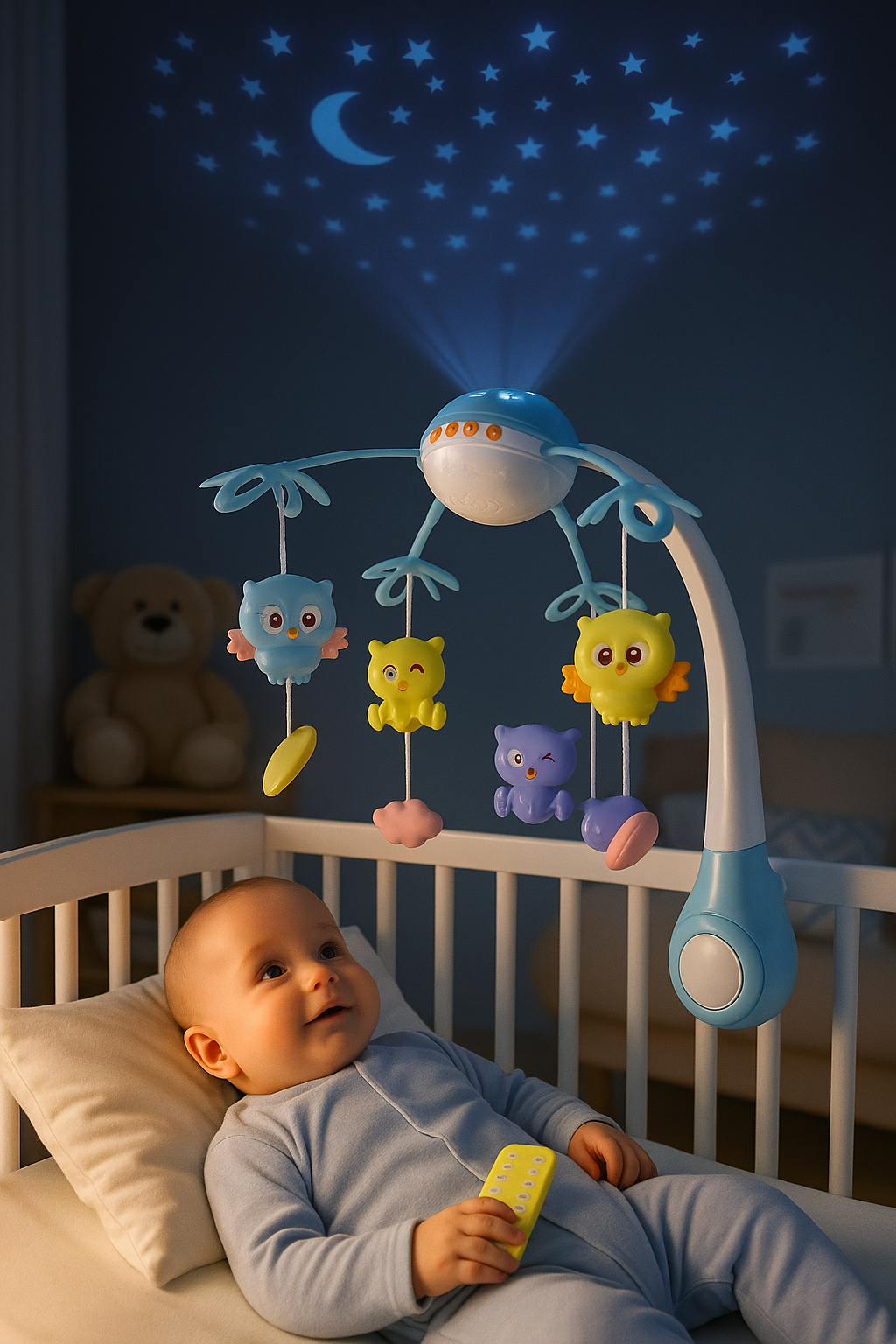 Proiectorul lumineaza usor tavanul cu stelute si luna, oferind o atmosfera relaxanta. Telecomanda inclusa permite controlul volumului, al melodiilor si al luminii fara a deranja copilul. Jucariile colorate pot fi folosite si ca jucarii de dentitie, fiind realizate din materiale sigure si netoxice.