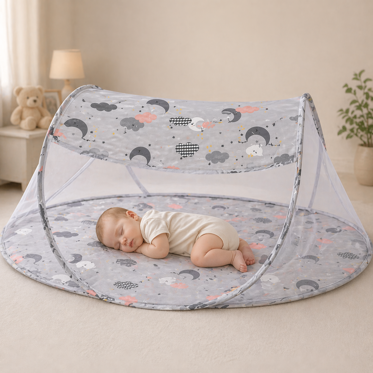Structura usoara si sistemul rapid de pliere permit utilizarea imediata si transportul fara efort. Suprafata moale si stabila sustine pozitia naturala de somn a bebelusului, iar marginile protejate asigura un plus de siguranta.