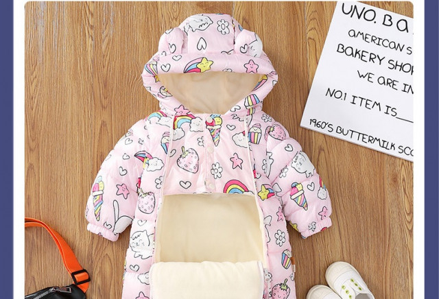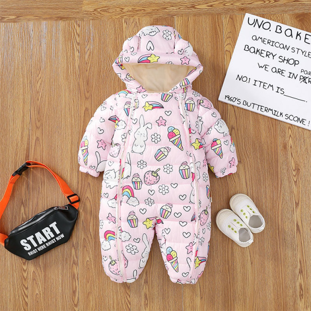 Combinezon fas captusit polar pentru fetite, cu gluga cu urechiuse si fermoar lateral. Culoare roz cu imprimeu iepurasi, inghetate si curcubee. Marimi 3-24 luni.