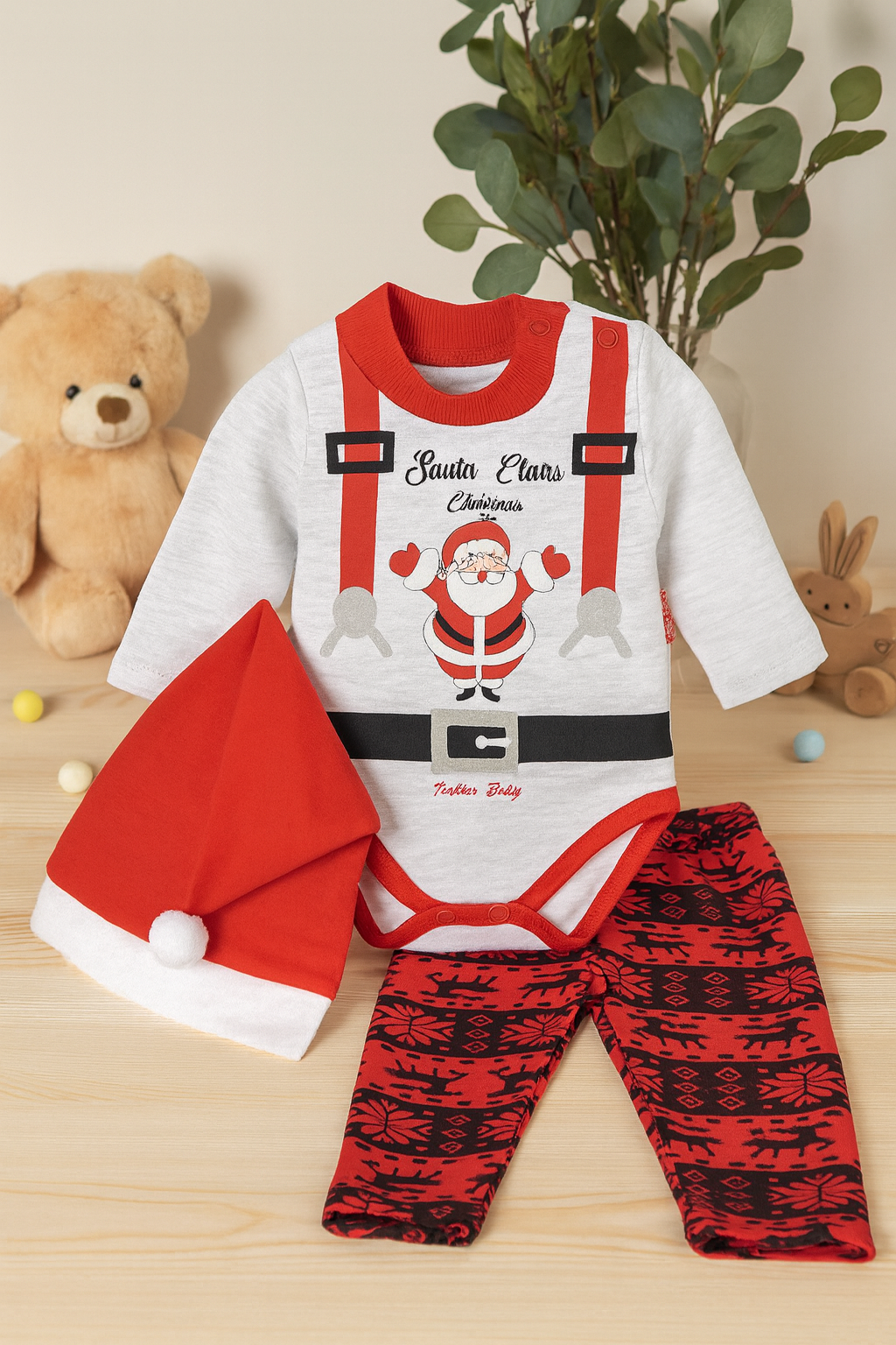 V-am pregătit un compleu perfect pentru a sărbători Crăciunul în stil. Acest compleu de Crăciun este format dintr-un body cu deschidere în capse pe umăr pentru o îmbrăcare ușoară și comodă, fes cu ciucure și pantaloni asortați. Este realizat din material 100% bumbac, care este moale și are o textură flaușată la interior pentru a menține micuțul confortabil și călduros în zilele reci de iarnă.