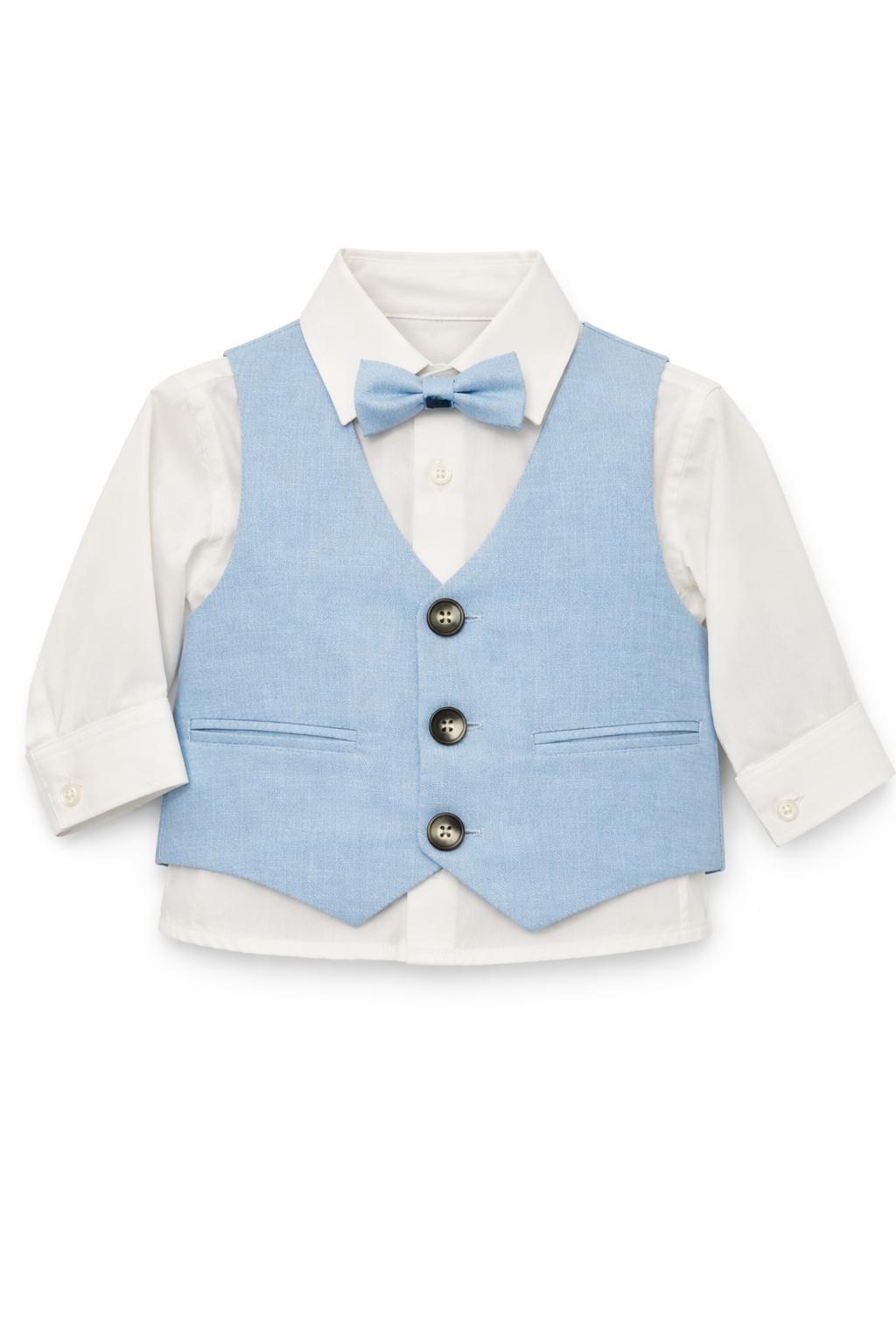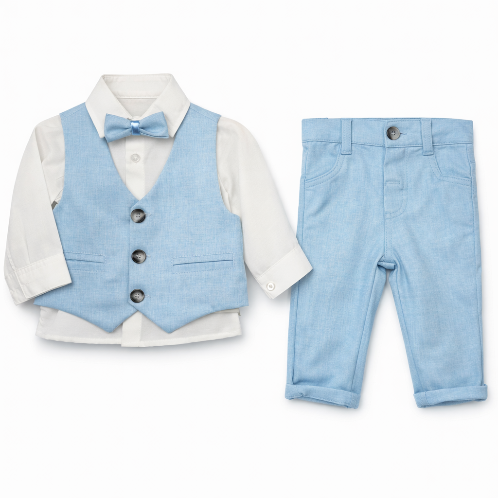 Vesta albastra completeaza perfect tinuta, avand o croiala moderna, cu nasturi frontali si buzunare decorative, oferind un look elegant specific unui costum pentru copii. Papionul asortat adauga un plus de stil si transforma outfitul intr-unul festiv.