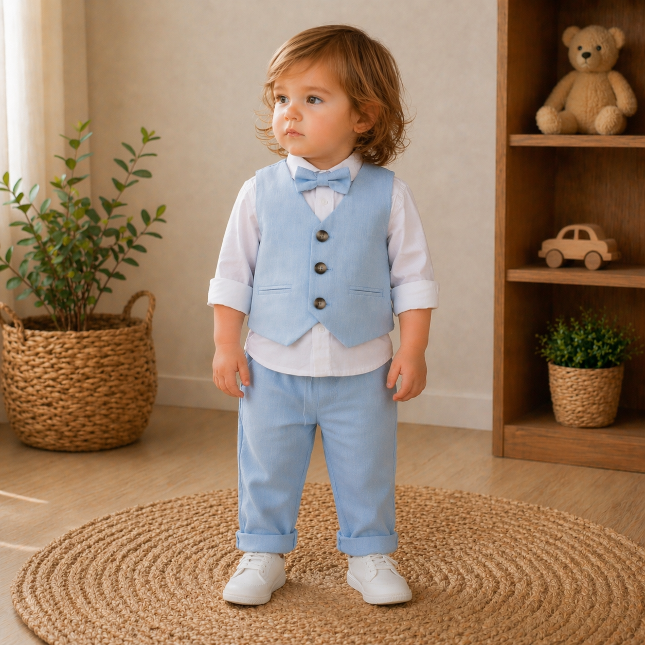 Vesta albastra completeaza perfect tinuta, avand o croiala moderna, cu nasturi frontali si buzunare decorative, oferind un look elegant specific unui costum pentru copii. Papionul asortat adauga un plus de stil si transforma outfitul intr-unul festiv.