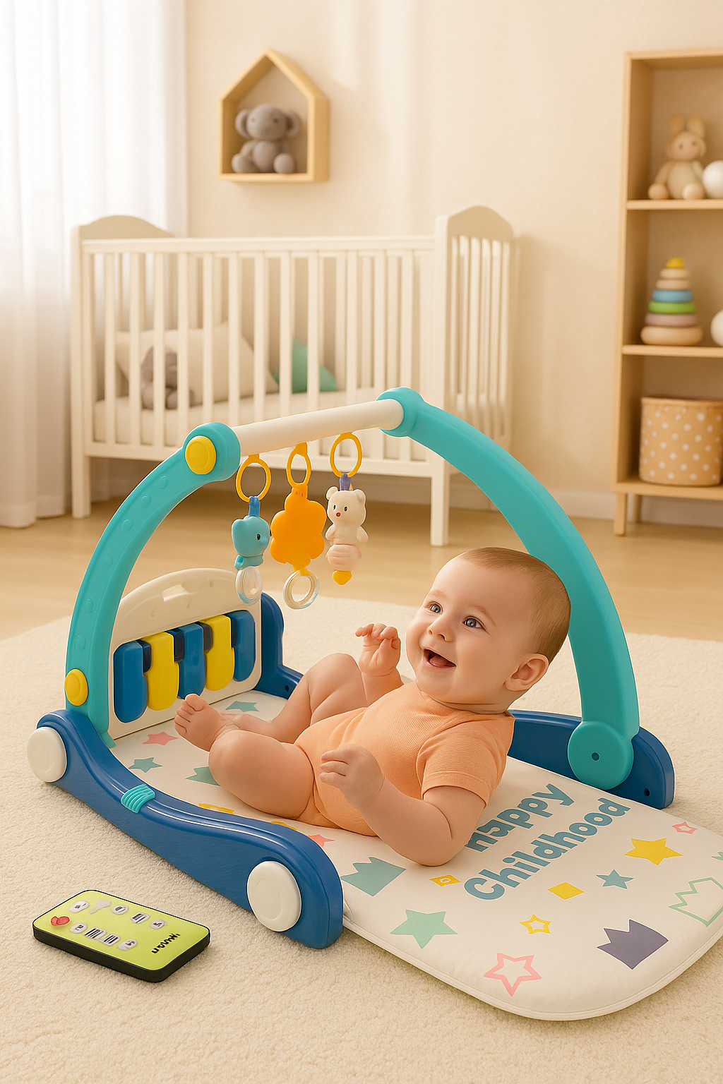 Dacă îbi dorești o jucărie educativă, sigură și plină de culoare pentru bebelușul tău, acest premergător 2 în 1 este alegerea perfectă. Poate fi folosit de la 0 luni și include un covoraș muzical textil cu panou multimedia, jucării senzoriale și un set de zornăitori adorabili.