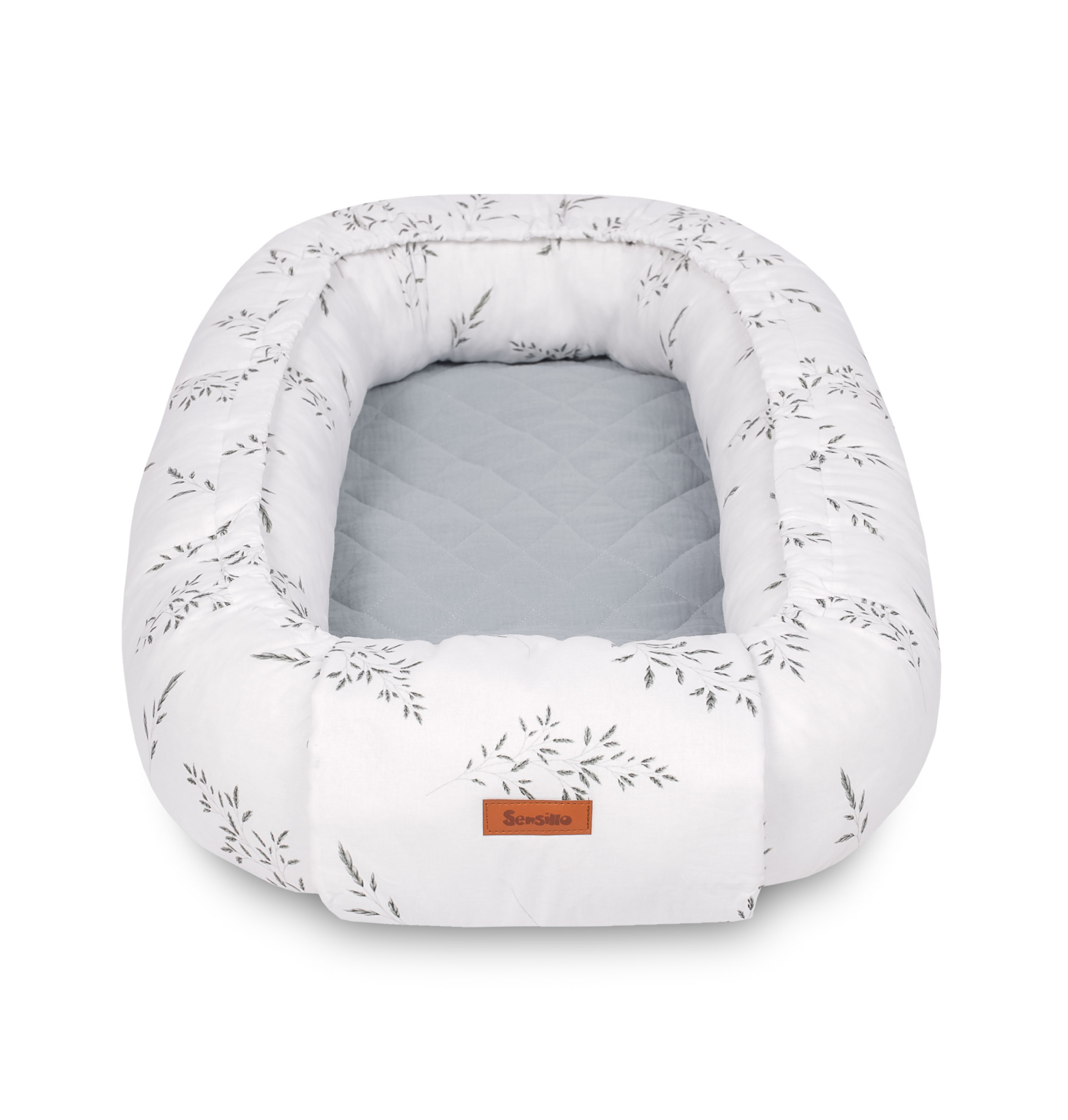 Baza cuibului este prevazuta cu o saltea detasabila si reversibila. O parte este realizata din muselina moale, iar cealalta din bumbac fin cu imprimeu delicat, oferind flexibilitate in functie de sezon sau preferinte.