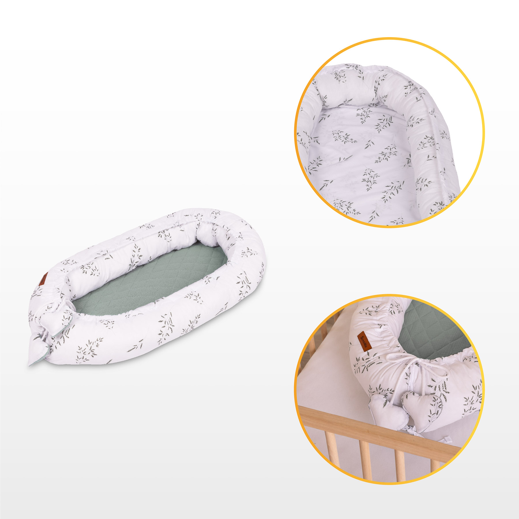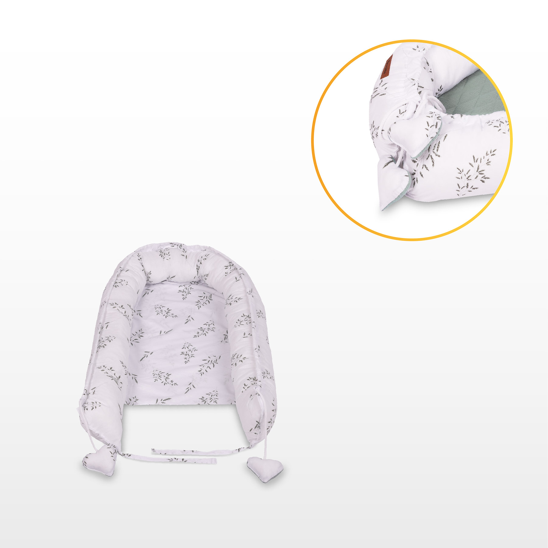 Setul include si o perna asortata, cu acelasi design ca baby nest-ul. Imaginile din galerie sunt cu titlu orientativ.