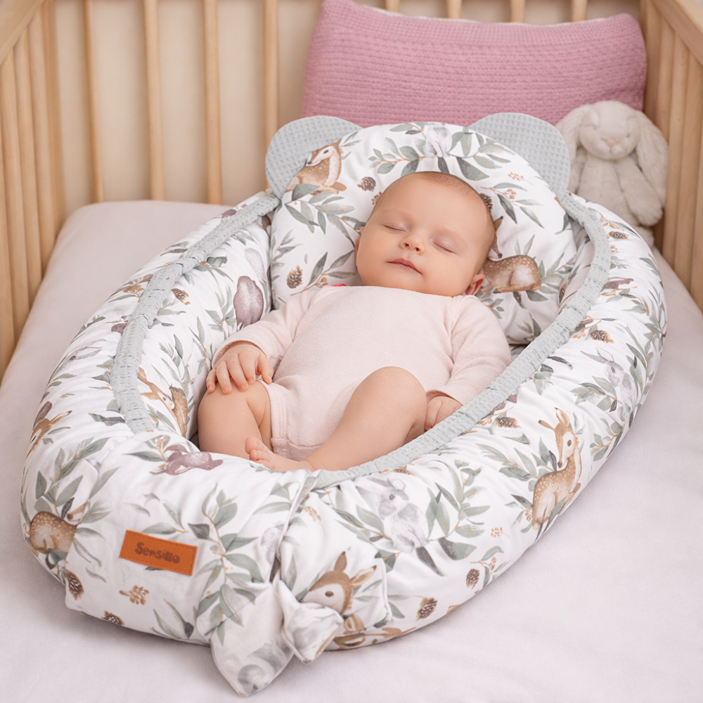 Cuibul poate fi utilizat in multiple situatii: in patul parintilor, pe canapea, in patut sau in timpul calatoriilor. Marginile inalte reduc riscul de rostogolire si contribuie la un somn linistit. Stratului exterior este realizat din 100% bumbac, un material aerisit si placut la atingere, potrivit pentru pielea sensibila a bebelusilor.