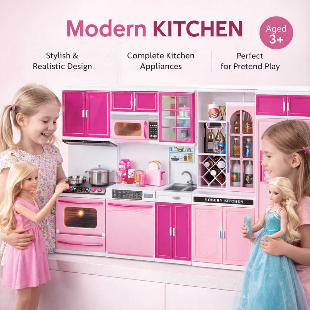 Setul include: frigider, chiuveta, cuptor cu microunde, masina de spalat vase, aragaz si dulapuri pentru depozitare. Fiecare element a fost proiectat atent pentru a imita mobilierul real de bucatarie. Dulapurile si electrocasnicele sunt prevazute cu usi care se deschid, permitand asezarea si scoaterea alimentelor si accesoriilor incluse.