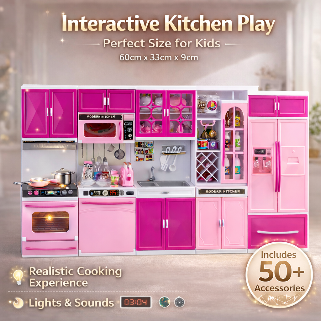 Bucataria este dotata cu efecte de lumina si sunet care cresc realismul experientei. Luminile si sunetele ce imita functionarea aparatelor de bucatarie atrag atentia copiilor si transforma joaca intr-o experienta interactiva.