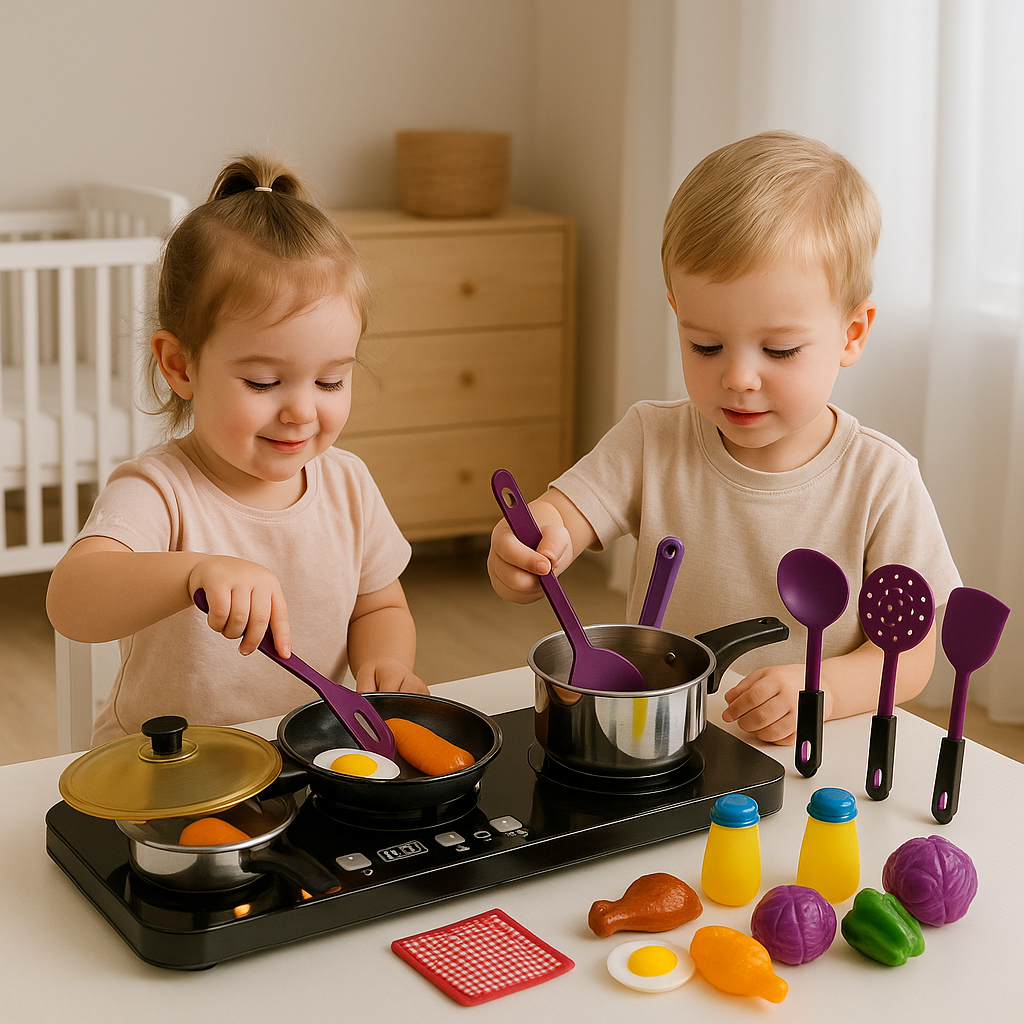 Daca copilului tau ii place sa se agite prin bucatarie in timp ce pregatesti o masala, setul nostru de accesorii de bucatarie din otel inoxidabil este jucaria perfecta. Cu ajutorul sau, vei putea crea propria bucatarie a copilului tau. Oalasi, craticioara, strecuratoarea si tigaia sunt doar cateva dintre elementele acestui set. Toate elementele sunt realizate din material de inalta calitate, datorita caruia arata exact ca omologii lor de dimensiuni reale. Datorita materialului din care sunt realizate, stralucesc si le poti simti greutatea in mana. Cea mai mare de avantaja a setului este numarul de elemente, care este numarul 32. Produsele alimentare sunt perfecte pentru gatit, copt si prajit.