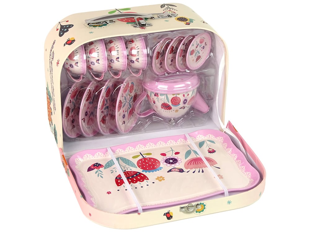 In interior gasesti un set complet pentru servire: cani, farfurii, ceainic si tava. Toate piesele au o cromatica roz delicata, cu modele atractive care capteaza imediat atentia si fac joaca si mai distractiva.