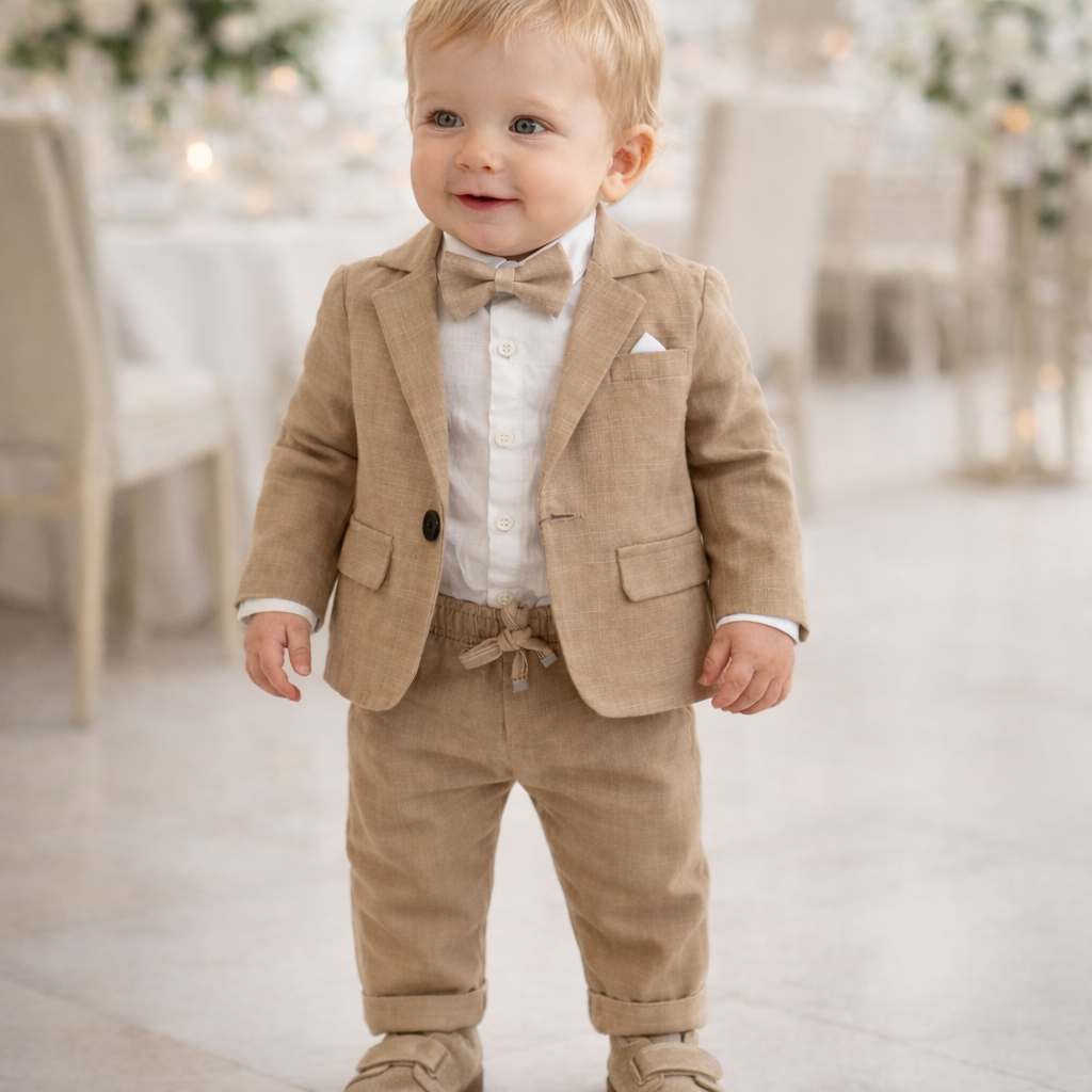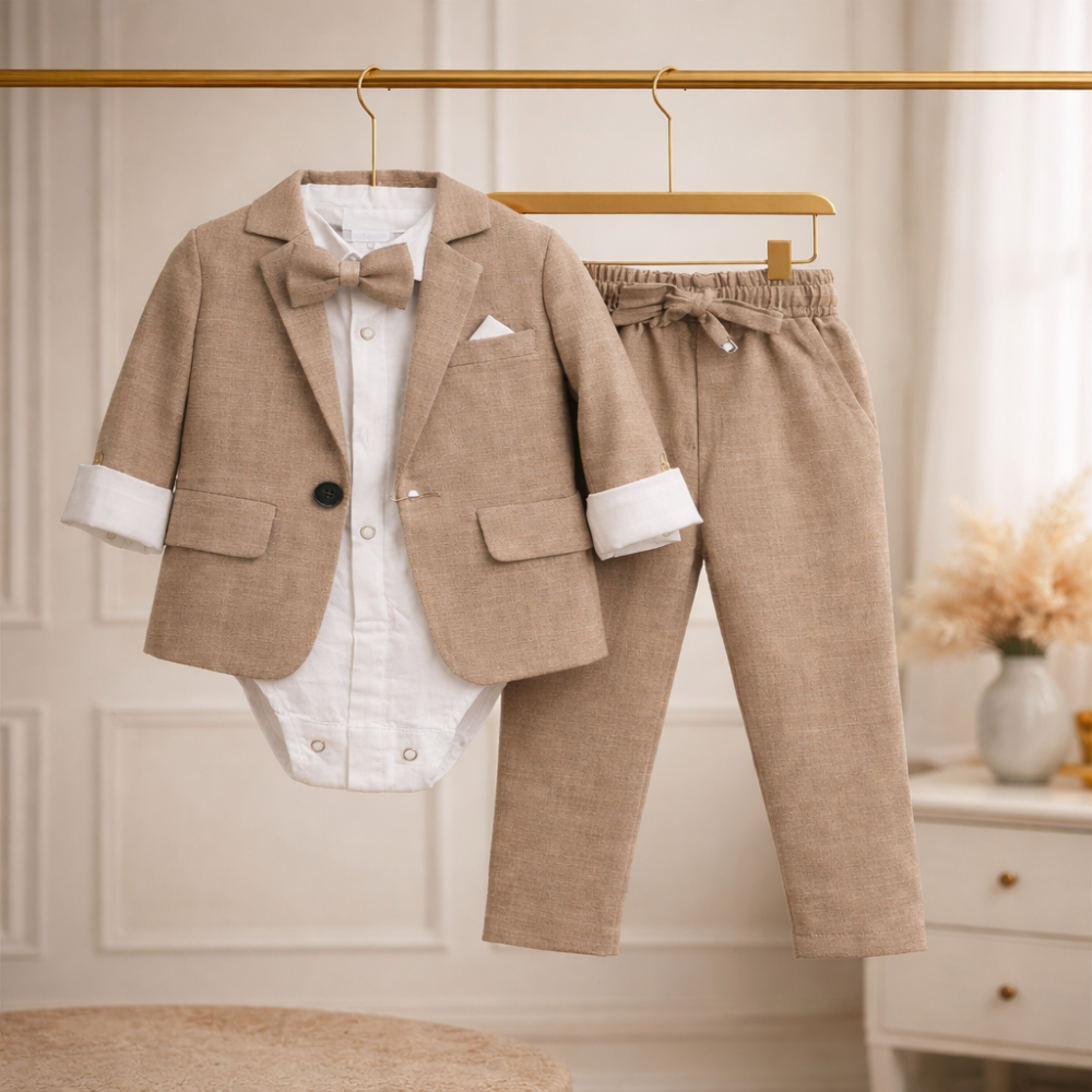 Costum bej, elegant pentru baieti, realizat din material 100% bumbac, ideal pentru evenimente speciale sau ocazii festive. Setul include sacou, camasa tip body cu capse pentru fixare usoara si pantaloni comozi cu snur, oferind atat eleganta, cat si confort.