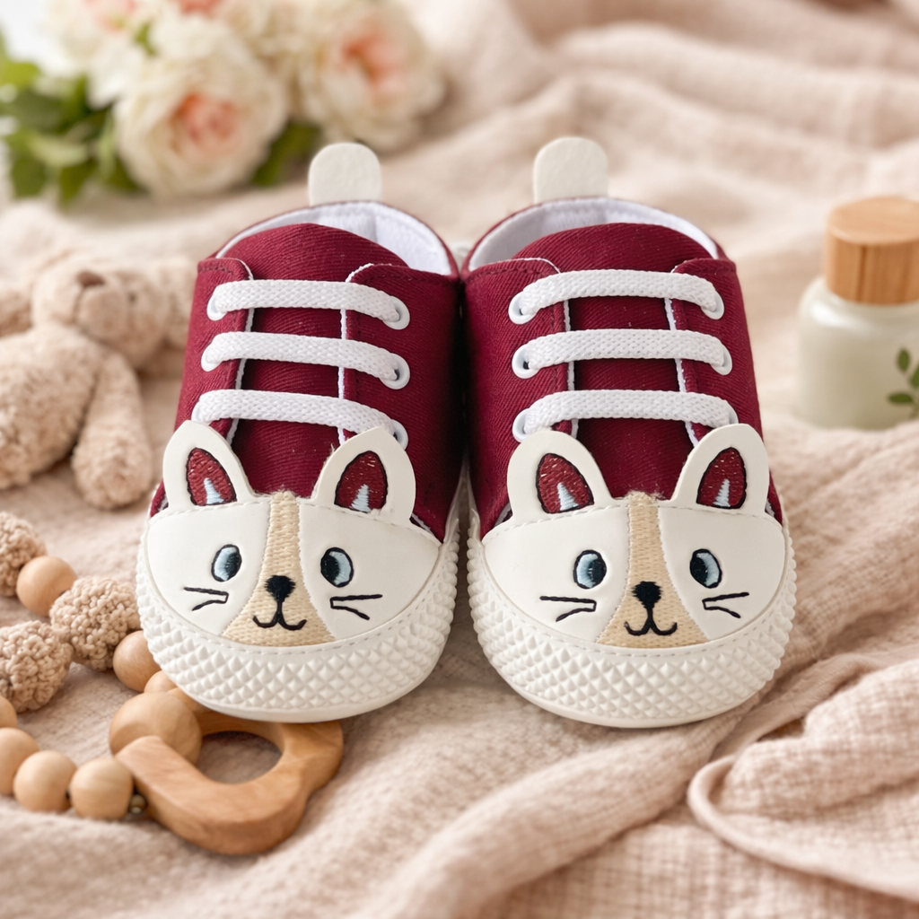 Tenisi pentru bebelusi in culoare visiniu, cu design simpatic tip pisicuta, marca LEONCINO SPORT, realizati din materiale moi si confortabile, ideali pentru primele luni de viata. Partea frontala este decorata cu fata de pisicuta, oferind un aspect jucaus si atractiv.