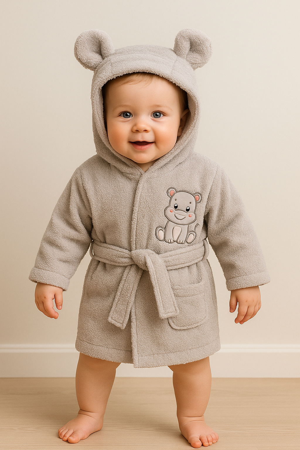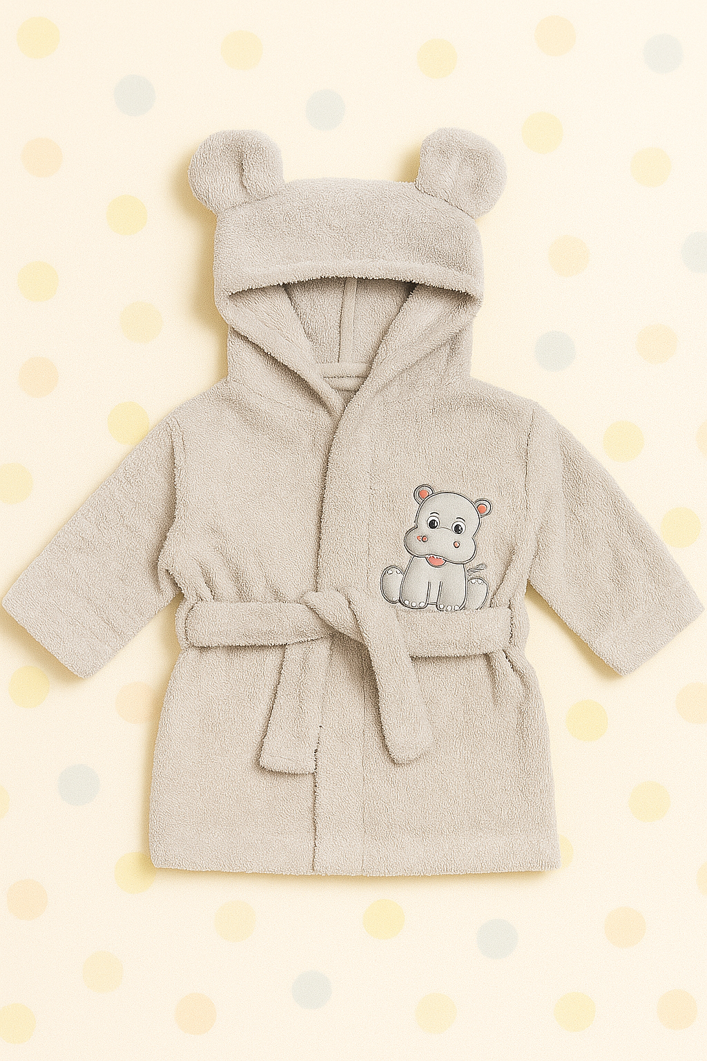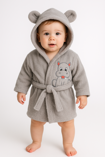Halat de baie pentru bebeluși, confecționat din 100% bumbac moale și absorbant, ideal după baie. Model cu glugă cu urechiușe și broderie hipopotam, pentru un aspect adorabil. Se leagă în talie cu cordon pentru ajustare ușoară. Textura este plăcută pe pielea sensibilă a bebelușului.
