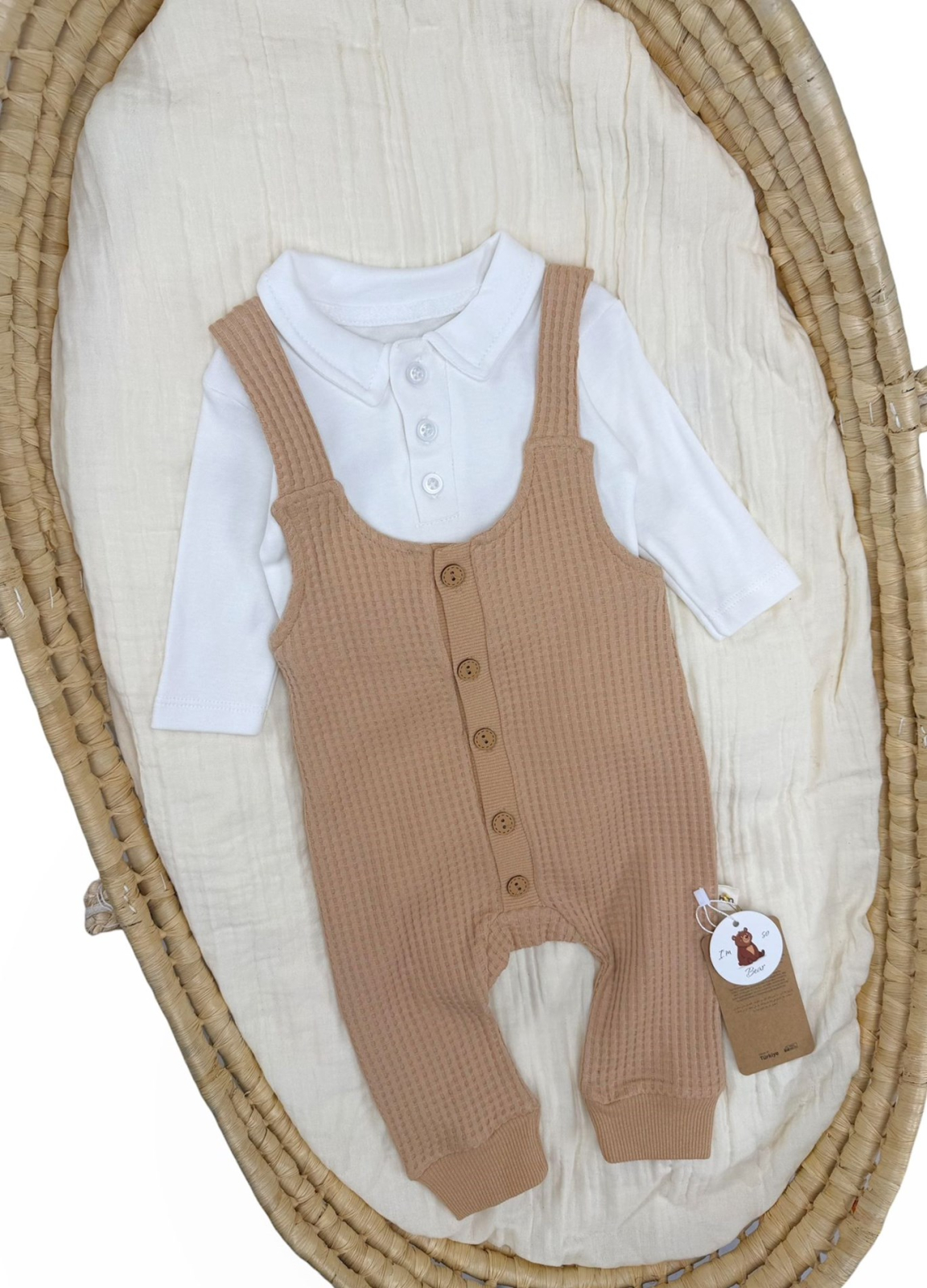 Set pentru bebelusi baieti format din salopeta din bumbac texturat si body tip bluza cu nasturi, realizat din materiale 100% bumbac, ideal pentru confort zilnic si un look elegant. Culoarea crem ofera un aspect cald si natural, usor de asortat in orice moment al zilei.