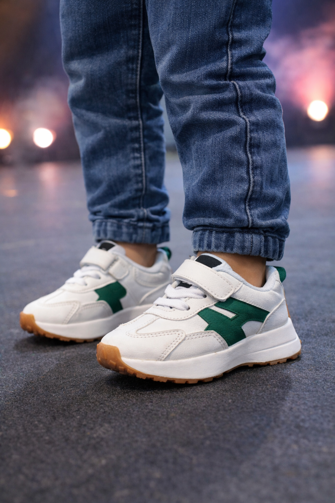 Adidasi pentru copii, din material tip piele ecologica, se inchid cu sireturi din elastic si bareta cu arici. Sunt prevazuti cu insertii verzi in laterale.