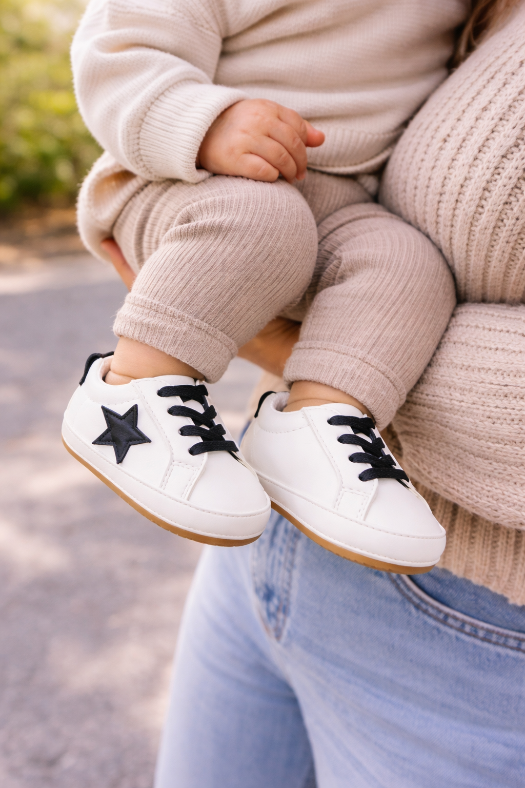 Adidasi pentru bebelusi din material tip piele ecologica, cu o stea neagra aplicata intr-o parte. Se inchid cu sireturi negre din elastic.