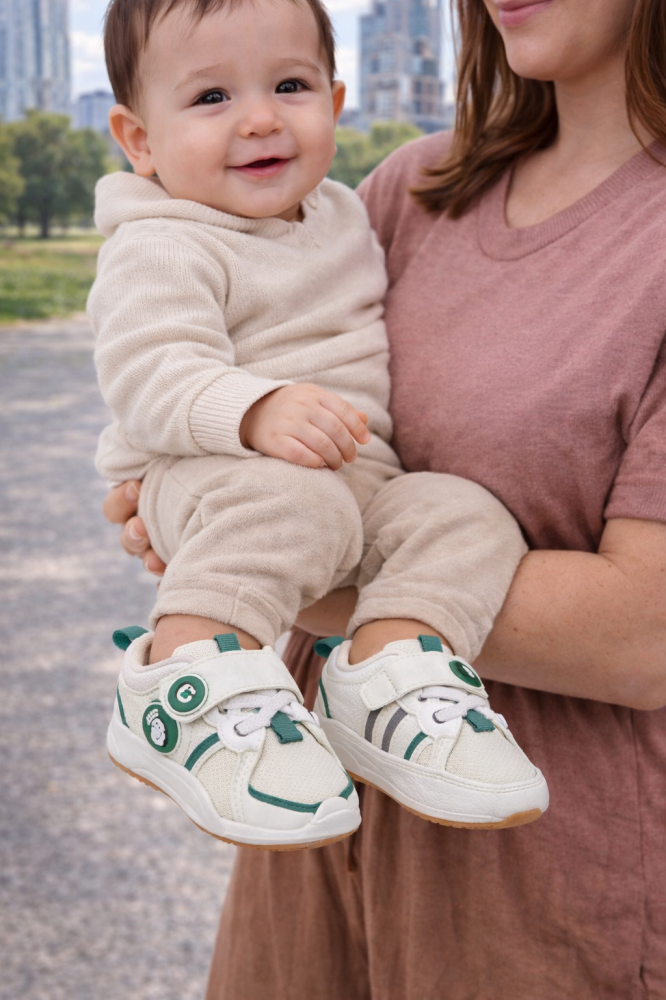 Ofera-i micutului tau confort si distractie cu acesti adidasi adorabili albi cu insertii verzi.