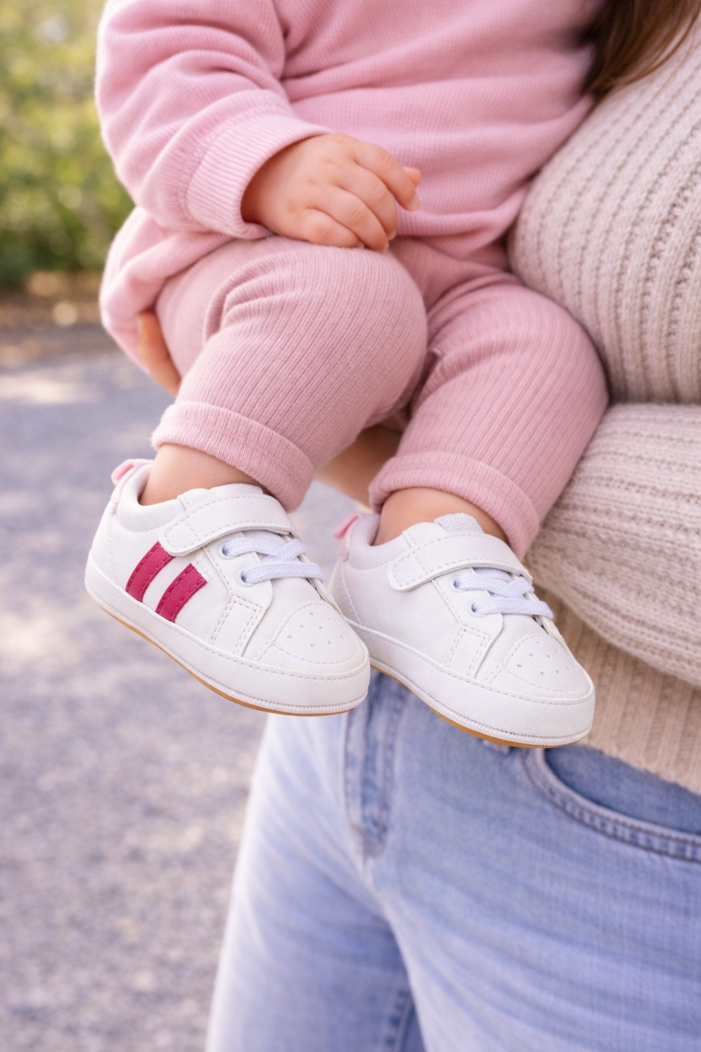 Primii pasi ai micutei tale merita confort, siguranta si un strop de culoare. Acesti adidasi albi pentru bebelusi, cu detalii roz ciclamen, sunt perfecti pentru fetite active, gata sa exploreze lumea.