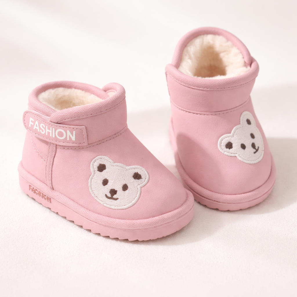 Cizmulite roz pentru bebelusi, imblanite, cu un design adorabil si un ursulet brodat in fata, perfecte pentru plimbarile din sezonul rece. Materialul tip piele ecologica intoarsa este moale si placut la atingere, iar captuseala pufoasa ajuta la pastrarea caldurii in zilele friguroase.