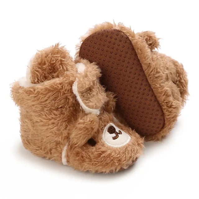 Cizmulite pentru bebelusi, din blanita moale si pufoasa, imblanite, se inchid cu bareta lata cu arici si sunt prevazute cu un ursulet aplicat in fata.