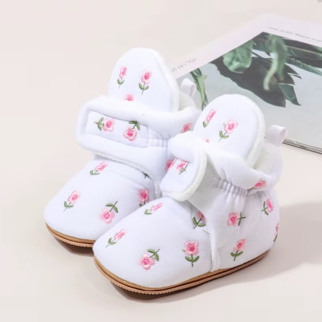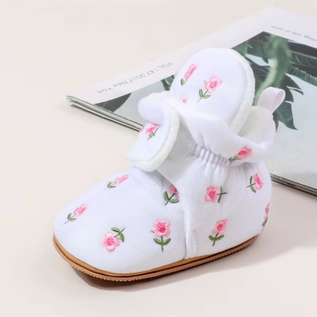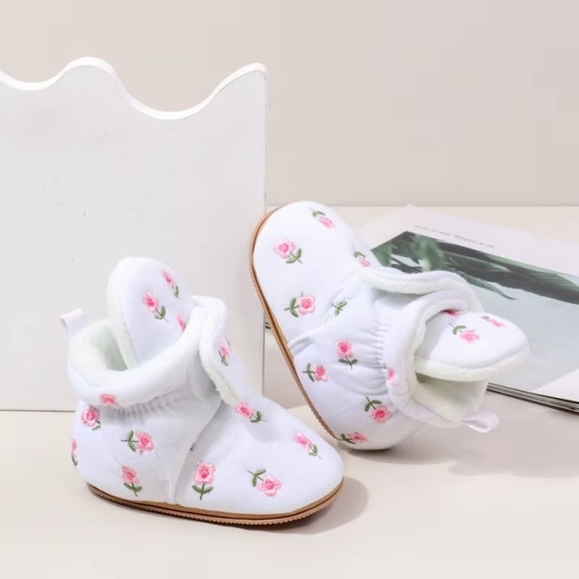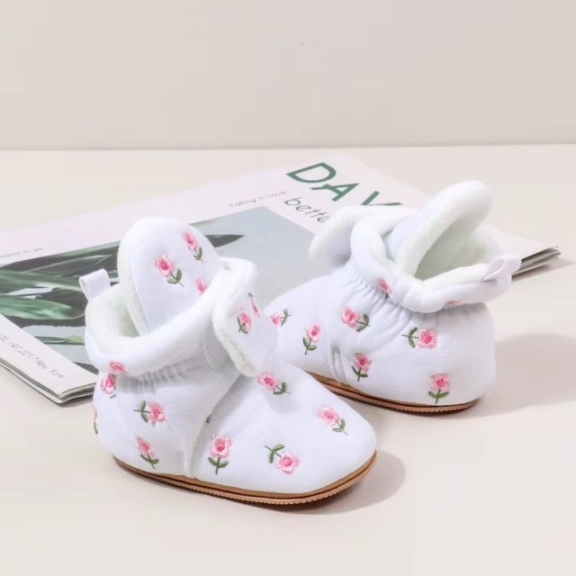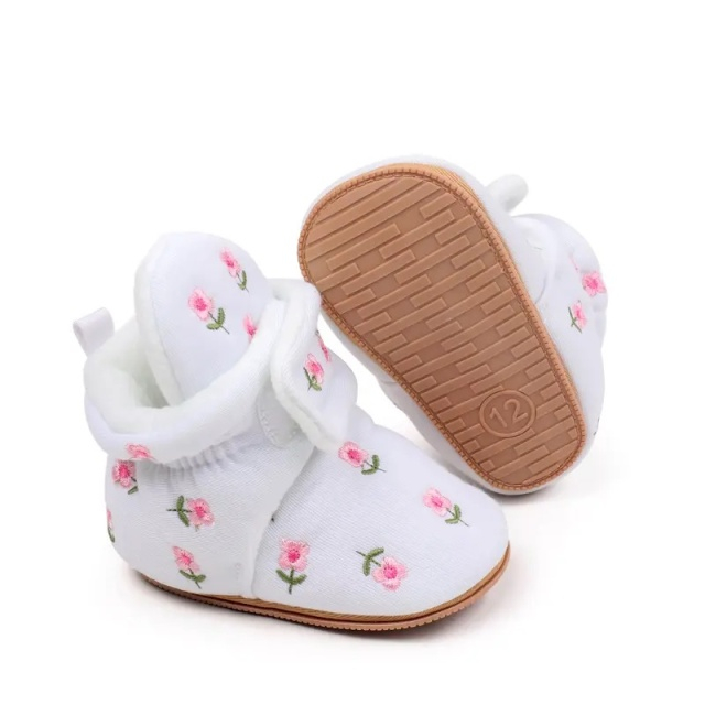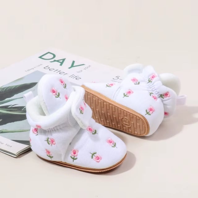 Cizmulite adorabile pentru bebelusi, albe, decorate cu broderie florala rafinata.