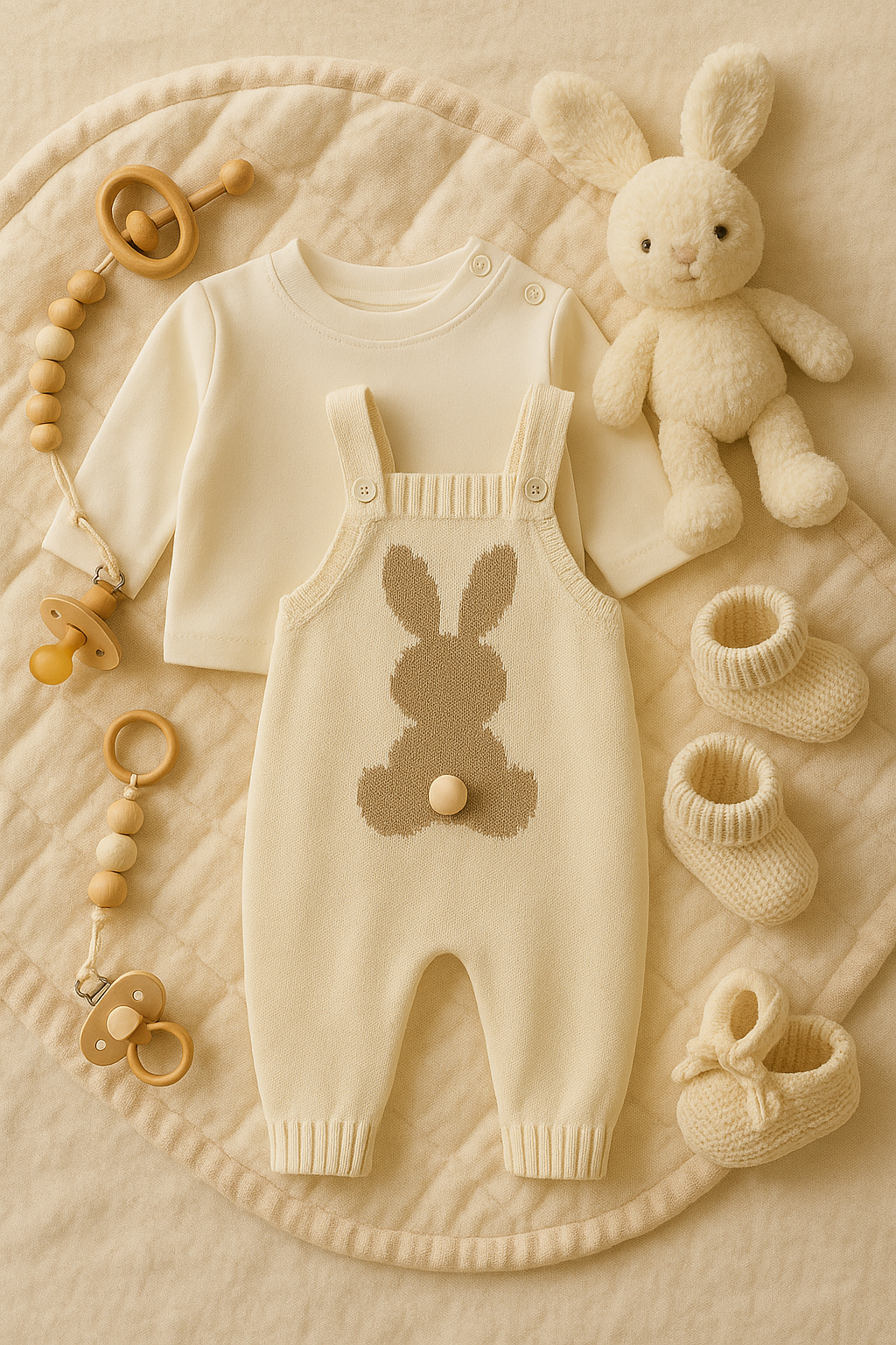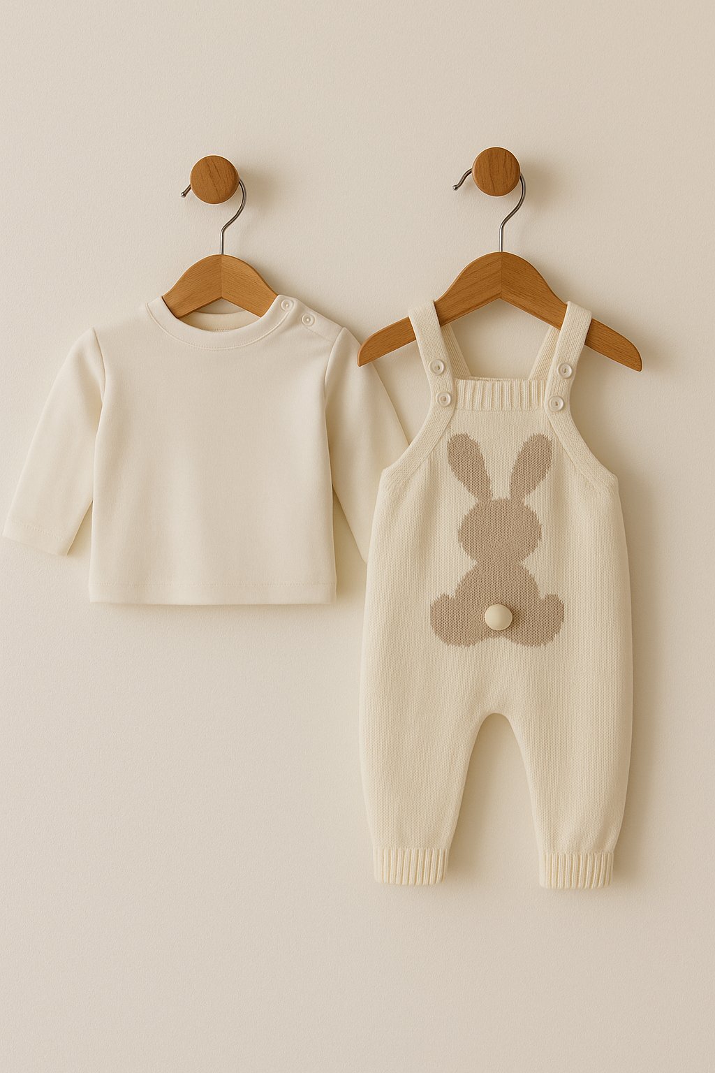Salopeta tricotata ❤️miniKay❤️ este alegerea ideala pentru mamicile care isi doresc haine moi, sigure si practice pentru bebelus. Este potrivita pentru 6-9-12 luni si are un imprimeu dragut cu iepuras gradinar, care o face si mai simpatica.