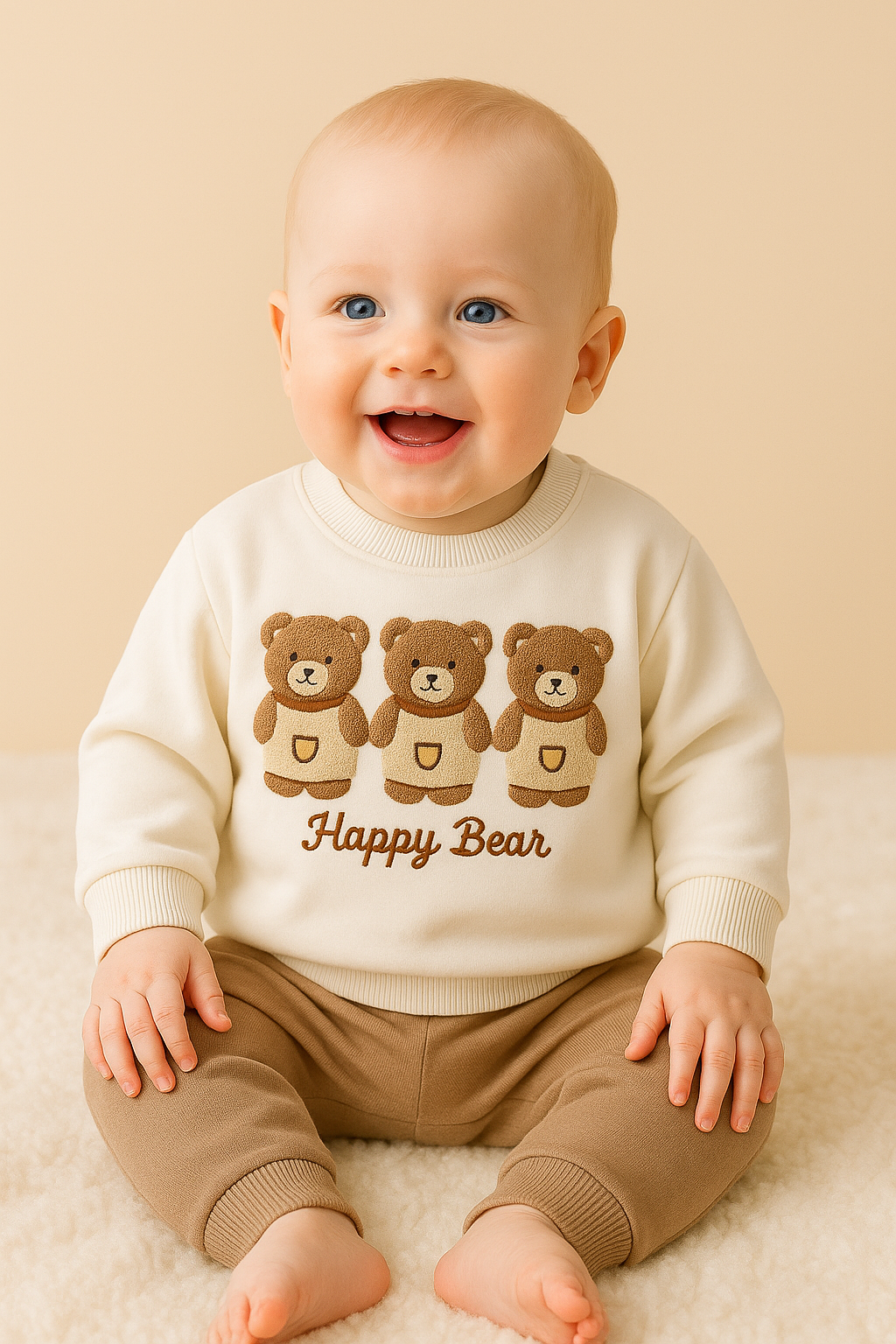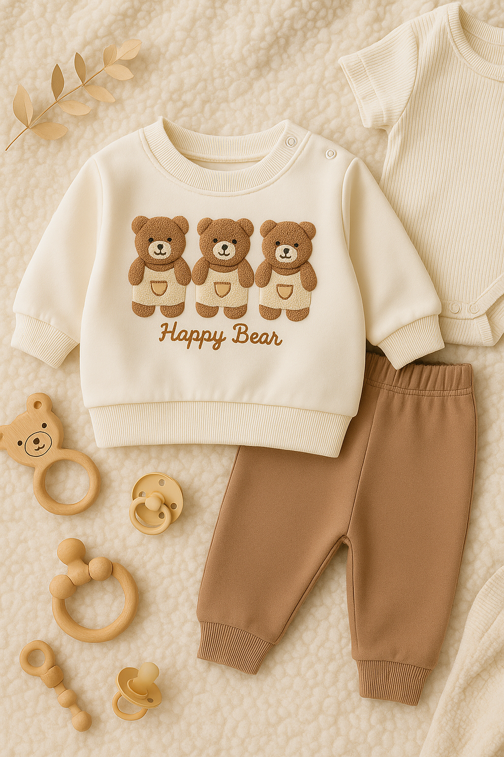 Setul compus dintr-un hanorac cu trei ursuleti mici si o pereche de pantaloni a fost adus pentru micutii care merita sa se simta liberi, protejati si iubiti in fiecare zi. Creat special pentru mamicile care cauta haine moi, sigure si usor de intretinut, acest set ofera confort, caldura si libertate de miscare in acelasi timp.