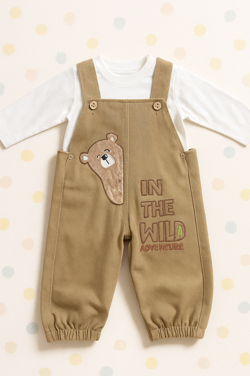 Salopetă cu bluzita pentru băieței, confecționată din 100% bumbac, plăcută la atingere și delicată cu pielea fină a bebelușului. Model cu ursuleț aplicat, exact ca în poză, și text brodat “In The Wild Adventure”, ideală pentru joacă și explorare. Bretele cu butoane, ușor de reglat, și elastic la glezne pentru o fixare comodă. Recomandată a se spăla la maximum 30°C.
