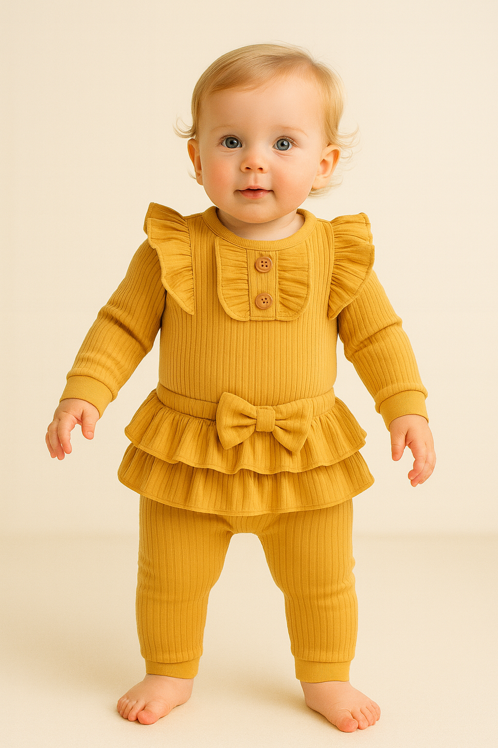 Set pentru fetițe din 100% bumbac, moale și confortabil, format din body cu mânecă lungă și volănașe decorative la umeri, închidere cu nasturi pe piept pentru îmbrăcare ușoară. Pantalonii asortați au volănașe în talie și fundă delicată, oferind un look elegant și jucăuș în același timp. Perfect pentru plimbări, poze și zile speciale.