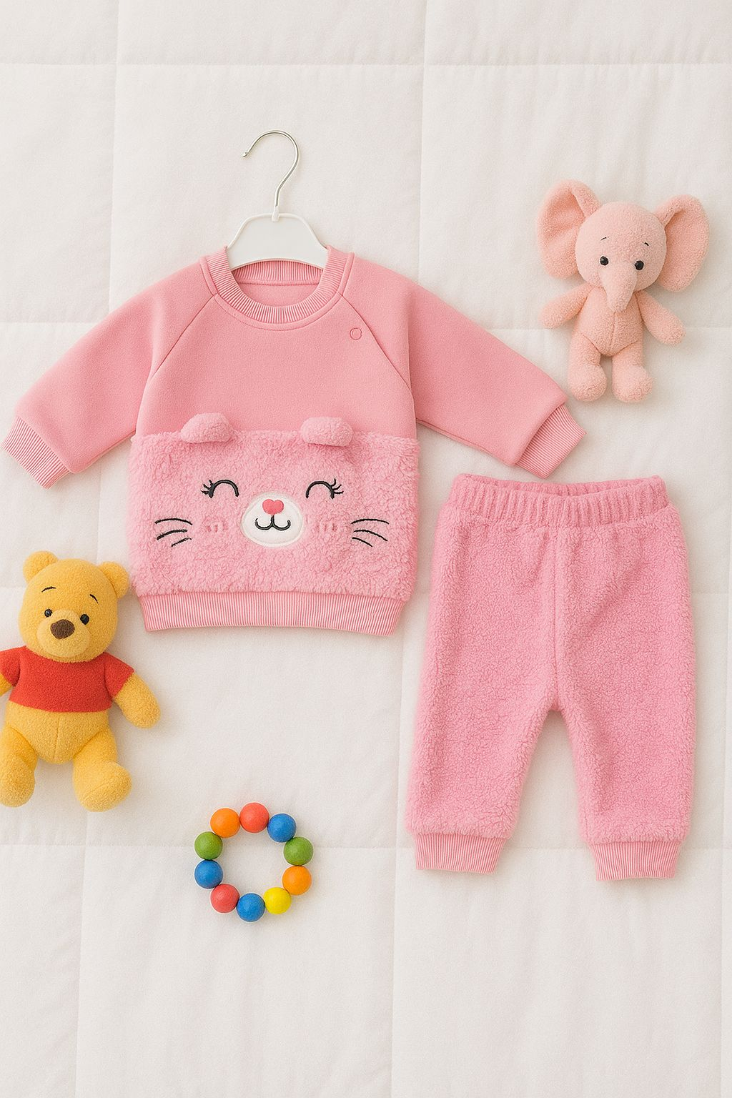 Pantalonii asortati sunt la fel de caldurosi, din acelasi material pufos, cu talie elastica moale ce nu strange si nu incomodeaza burtica bebelusului. Mansetele la glezne mentin pantalonii la locul lor, oferind libertate de miscare si confort pe tot parcursul zilei.