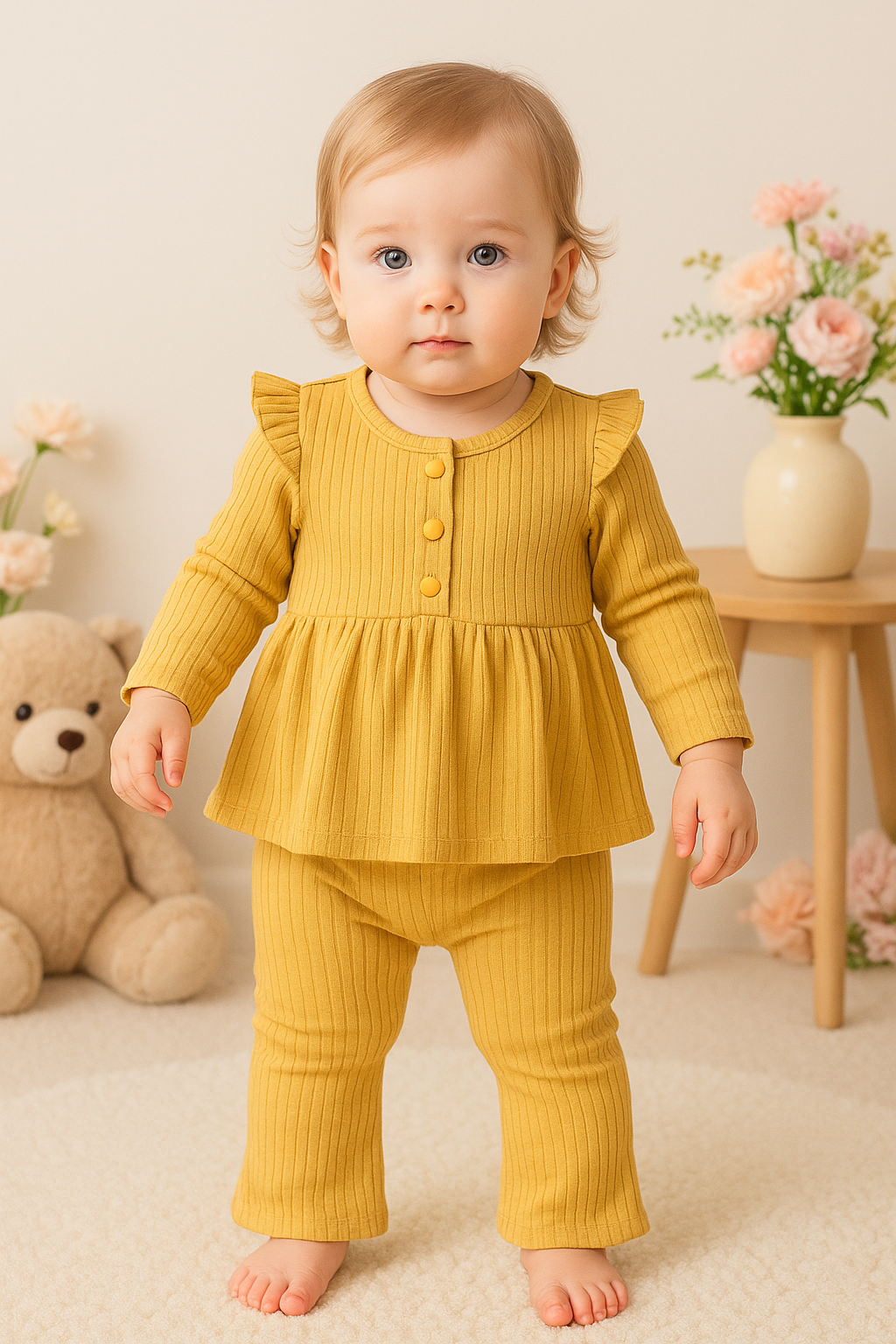 Set Fetite Rib Mustar Bluza Volanase Pantaloni Elastici