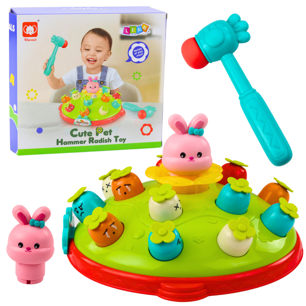 Dupa ce asezi iepurasul in mijlocul platformei si il rotesti, incepe distractia! Copilul foloseste un ciocan sigur, cu varf moale, pentru a lovi morcovii. In functie de pozitia iepurasului, unul dintre morcovi activeaza un mecanism special, iar iepurasul sare brusc in sus, provocand rasete si entuziasm de fiecare data.