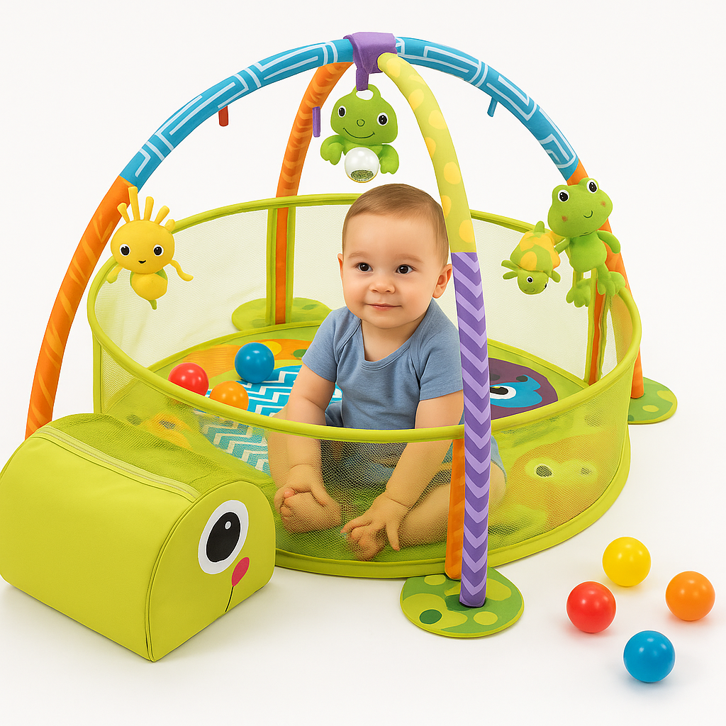 In timp ce sta intins, bebelusul isi dezvolta abilitatile motorii si coordonarea mana-ochi incercand sa apuce jucariile suspendate. Cand incepe sa faca primii pasi, se poate juca in tarcul cu mingi, plasa laterala oferind un spatiu sigur.