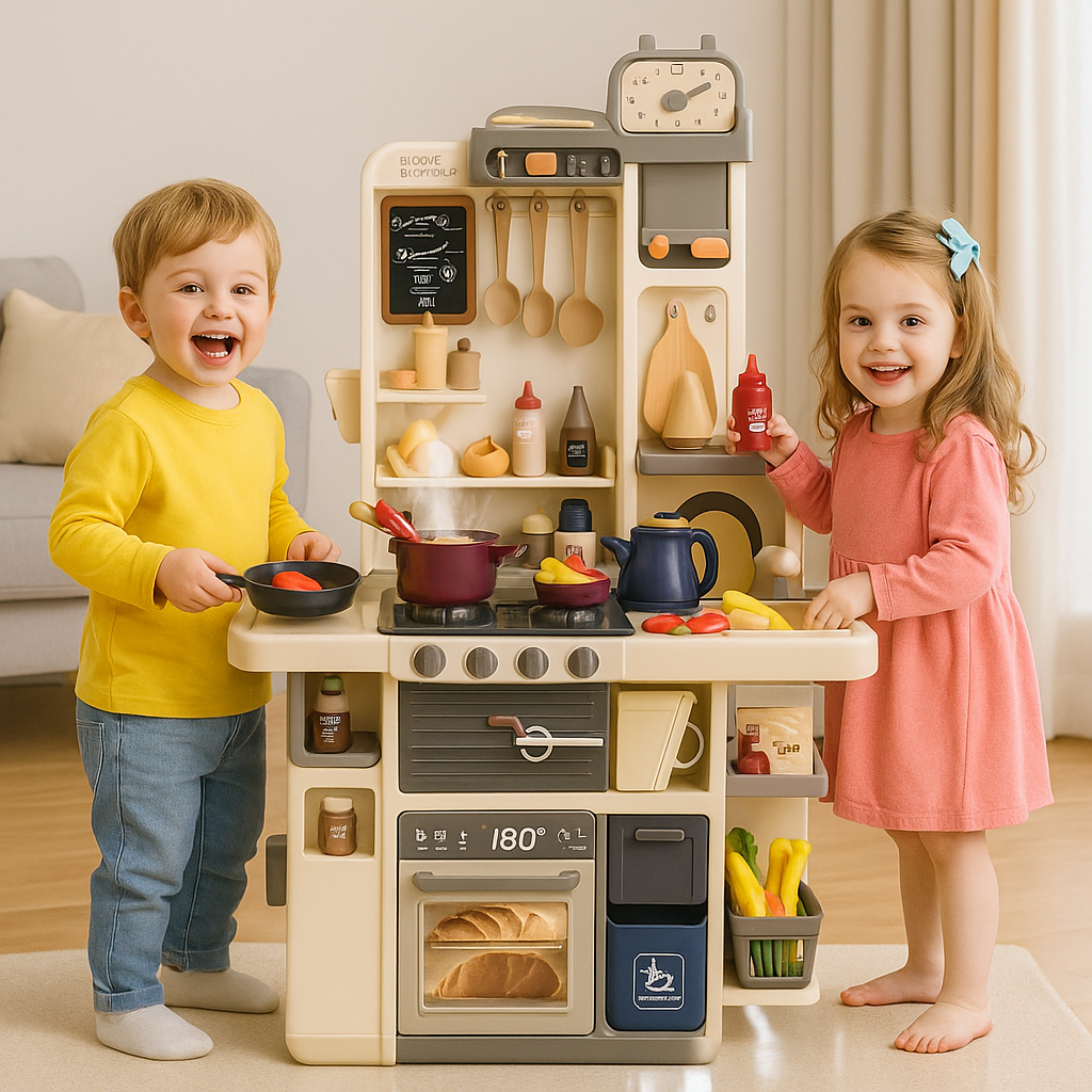 Bucataria moderna pentru copii cu efect de abur (spray) este alegerea ideala pentru micii bucatari care adora joaca de rol si pregatirea meniurilor imaginative. Setul include o multime de accesorii realistice si functii interactive care ii incurajeaza pe cei mici sa experimenteze, sa invete si sa creeze retete jucause intr-un mod sigur si distractiv.