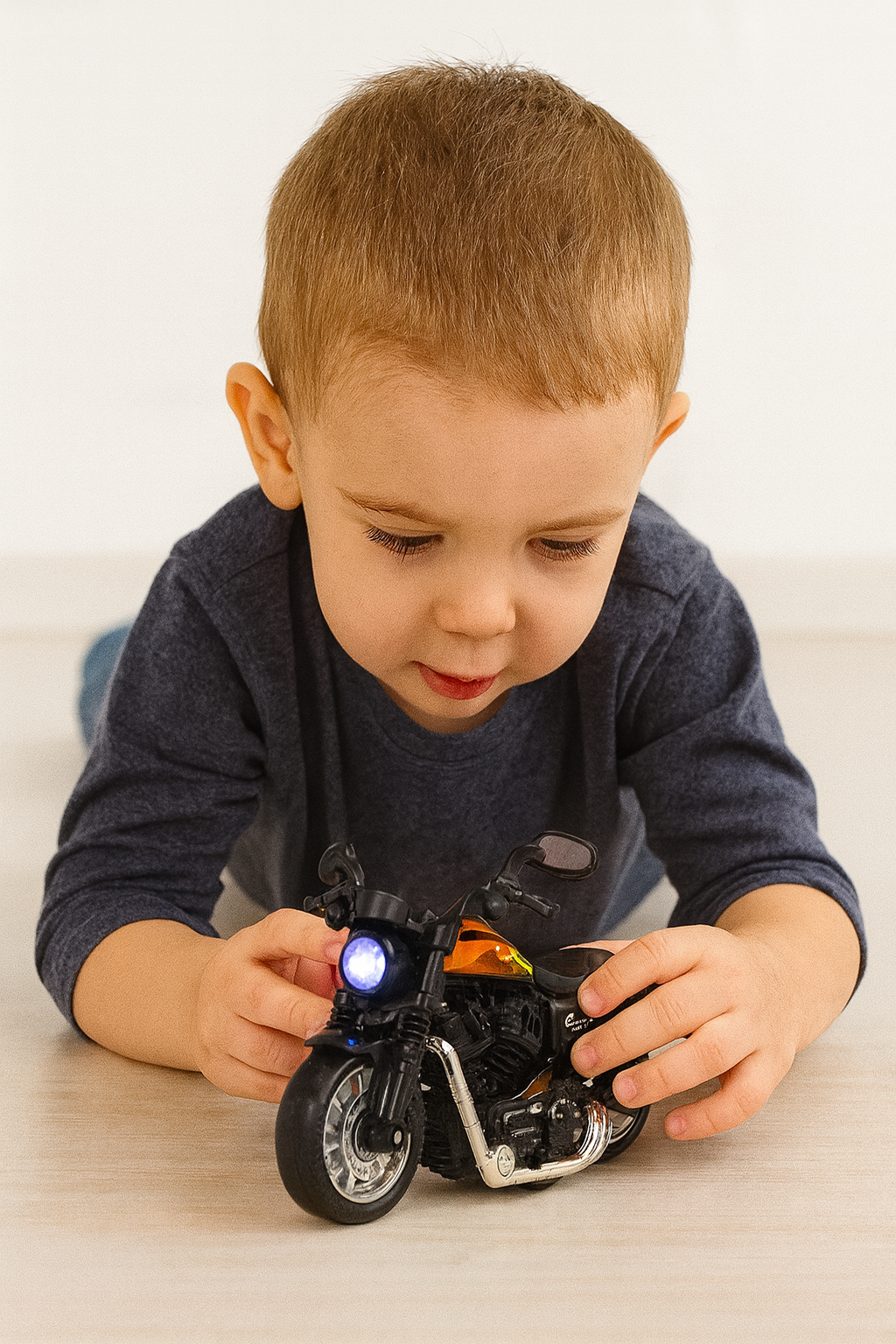 Efectele luminoase si sonore sunt activate prin apasarea motocicletei pe o suprafata. Farurile frontale lumineaza traseul, iar sunetul de motor si claxonul redau atmosfera unei curse adevarate, captand atentia si stimuland imaginatia copilului.