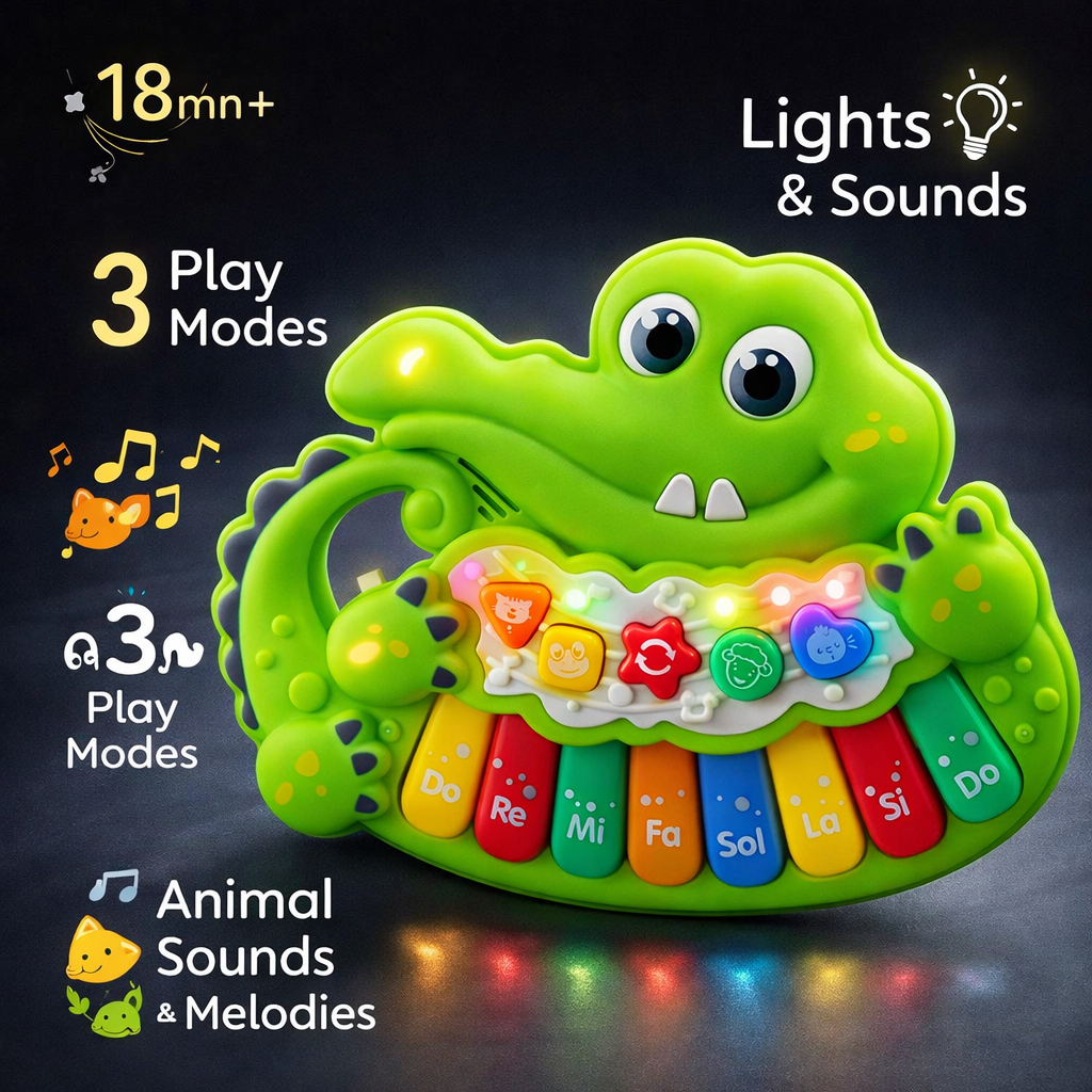 Pian în formă de crocodil cu lumini LED, sunete de animale și melodii – 3 moduri interactive, design sigur și ergonomic pentru copii 18 luni+.