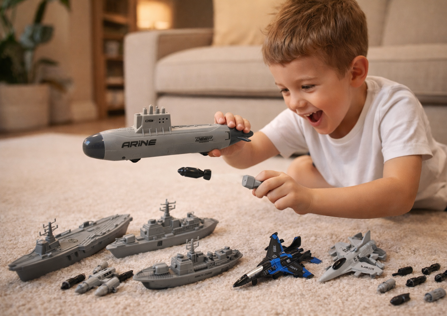 Avioanele din set au marcaje caracteristice in culori militare, fiind perfecte pentru „supravegherea” situatiei din aer in timpul bataliei. Submarinul este prevazut cu roti, ceea ce il face usor de deplasat pe podea si il transforma intr-un element interactiv si practic in timpul jocului.