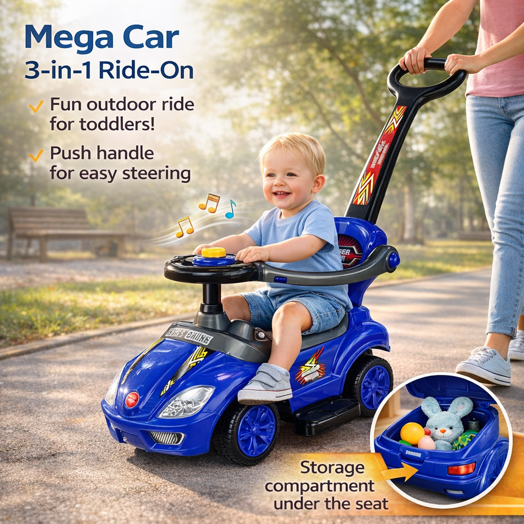 Masinuta pentru copii Mega Car 3in1 cu maner de impingere a fost proiectata special pentru copiii energici care iubesc plimbarile in aer liber. Vehiculul se deplaseaza foarte usor, fiind suficient ca parintele sau insotitorul sa impinga manerul conectat la masina. Pe masura ce copilul creste si configuratia este modificata, transformand produsul din pchac in masinuta ride-on, micutul sofer poate prelua controlul deplasandu-se singur prin impingerea cu picioarele.