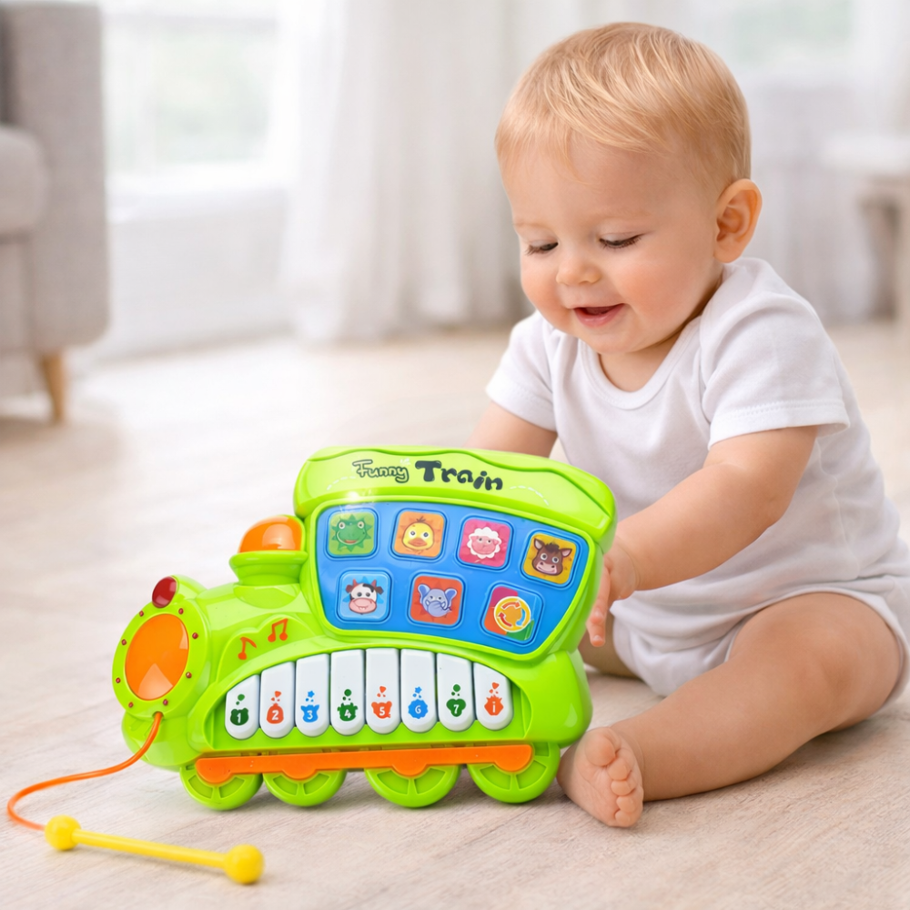 Pianul educativ electric in forma de locomotiva verde este o jucarie interactiva si vesela, conceputa special pentru a-i ajuta pe cei mici sa descopere lumea sunetelor si a muzicii intr-un mod distractiv si intuitiv. Designul colorat si forma prietenoasa de locomotiva atrag imediat atentia copilului si incurajeaza joaca activa.