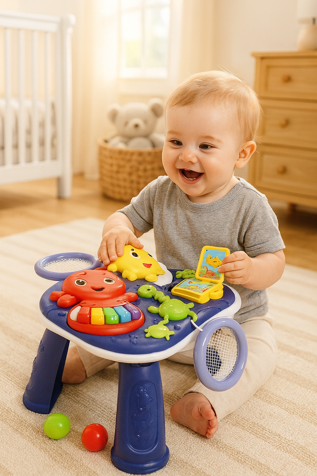 O masă educativă plină de activități interactive și colorate, ideală pentru dezvoltarea copiilor de la 18 luni în sus! Descoperă animale marine, sunete, forme și chiar jocuri sportive într-un singur loc.