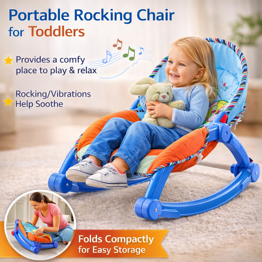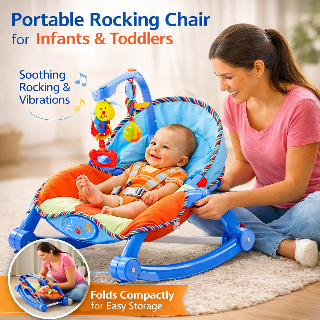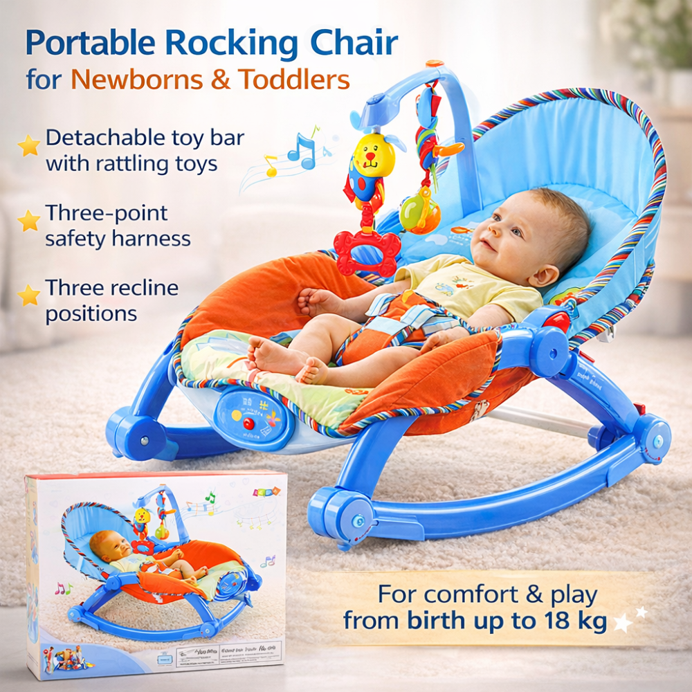 Scaun balansoar colorat pentru bebelusi cu 3 pozitii de inclinare, centuri de siguranta in 3 puncte si jucarii zornaitoare. Ideal pentru relaxare, joaca, hranire si somn de la nastere pana la 18 kg.