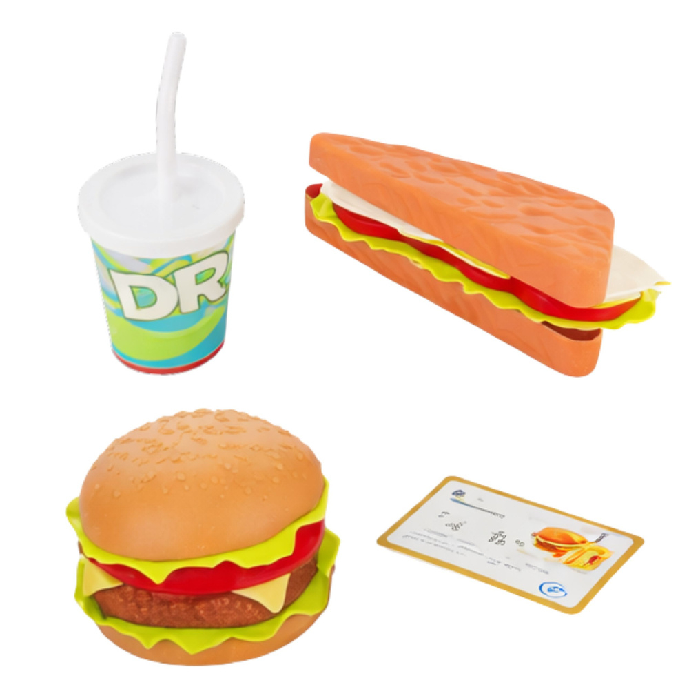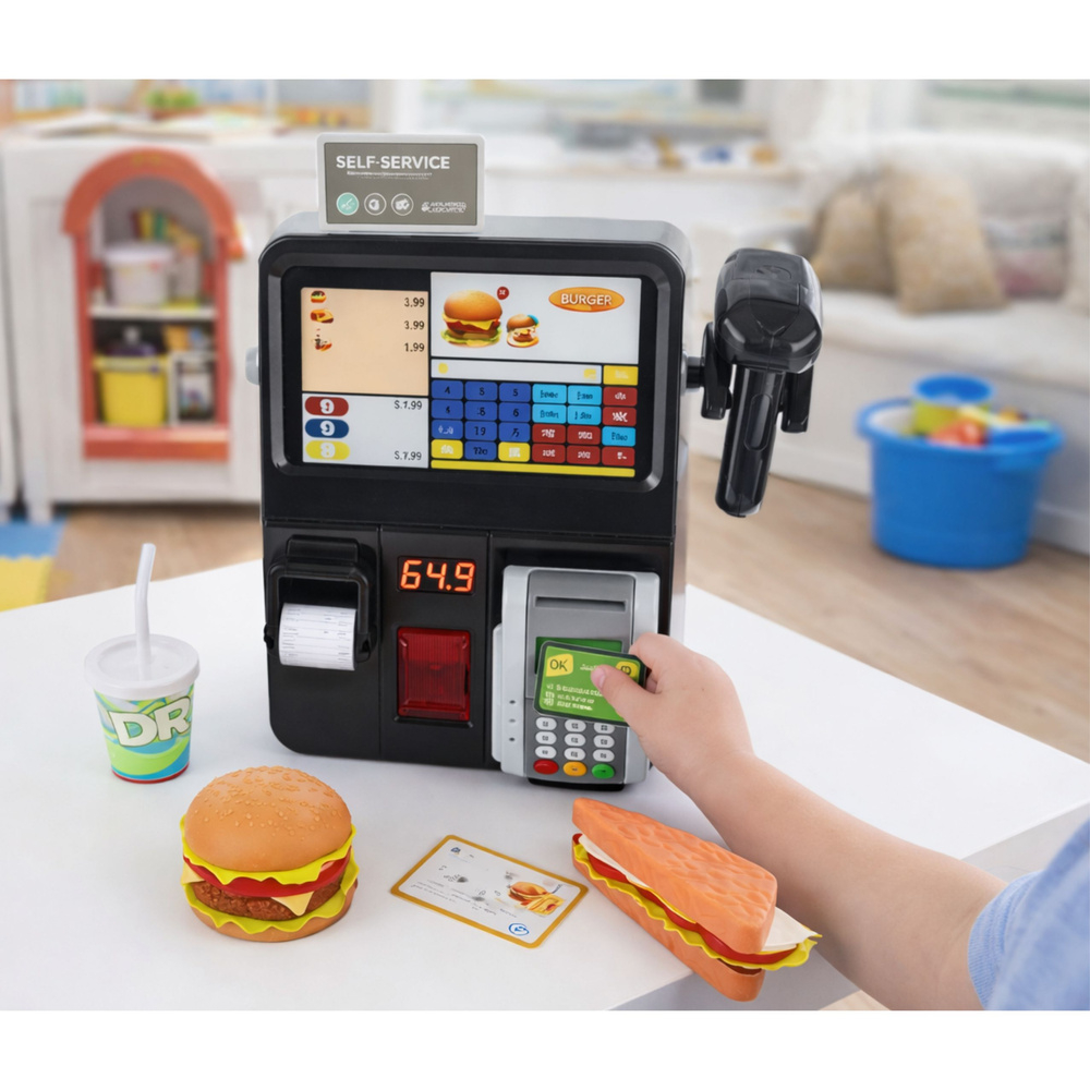 Copiii pot scana produsele, pot emite bonuri, pot folosi terminalul de plata si pot realiza activitati realiste de vanzator sau casier. Setul include casa de marcat, terminal POS, scanner si elemente inspirate din zona fast food, fiind ideal pentru jocuri tematice de restaurant.