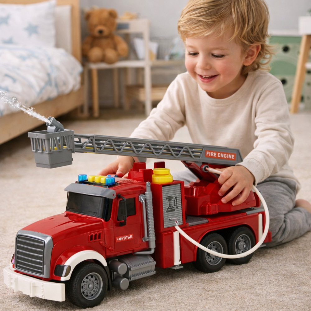 Masina este prevazuta cu un rezervor special pentru apa, situat in partea superioara a cabinei, prin care apa poate fi turnata cu usurinta. Dupa umplere, prin apasarea butonului dedicat, furtunul montat in partea laterala va pulveriza apa, oferind o experienta de joaca realista si captivanta. Copilul poate simula stingerea incendiilor si poate crea propriile scenarii de salvare.