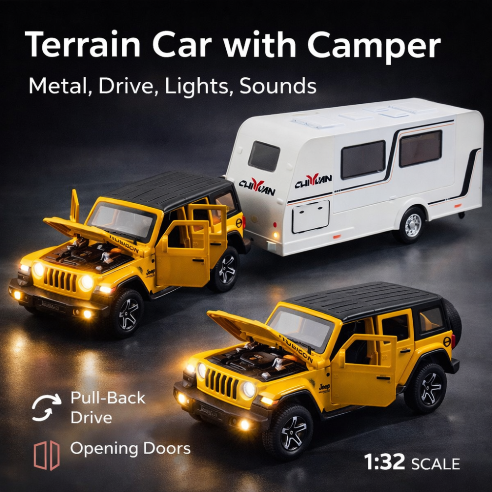 Setul reda fidel detaliile unui vehicul off-road real si ale unei rulote moderne, fiind ideal atat pentru joaca zilnica, cat si pentru colectionari. Scara 1:32 ofera proportii realiste si o prezenta impunatoare pe raft.